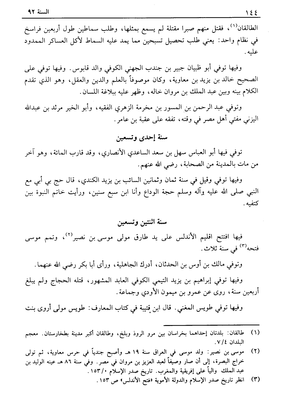 فيها افتتح اقليم الأندلس على يد طارق مولى موسى بن نصير، تمم موسى فتحه في سنة ثلاث. وتوفي مالك بن أوس بن الحدثان، ادرك الجاهلية، ورأى أبا بكر رضي الله عنهما. وفيها توفي ابراهيم بن يزيد التيمي الكوفي العابد المشهور، قتله الحجاج ولم يبلغ أربعين سنة، روى عن عمرو بن ميمون الأوثي وجماعة. وفيها توفي طويس المغني. قال ابن قتيبة في كتاب المعارف: طويس مولى أروى بنت