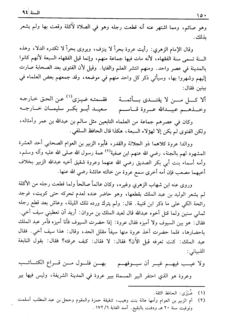 وهوصائم، ومما اشتهر عنه أنه قطعت رجله وهو في الصلاة لآكلة وقعت بها ولم تشعر بذلك. وقال الإمام الزهري: رأيت عروة بحراً لا ينزف، ويروى بحراً لا تكدره الدلا، وهذه السنة تسمى سنة الفقهاء، لأنه مات فيها جماعة منهم، وإنما قيل الفقهاء السبعة لأنهم كانوا بالمدينة في عصر واحد. ومنهم انتشر العلم والفتيا. وقيل لأن الفتوى بعد الصحابة صارت إليهم وشهروا بها، وسيأتي ذكر كل واحد منهم في موضعه، وقد جمعهم لعض العلماء فى بيتين فقالى: