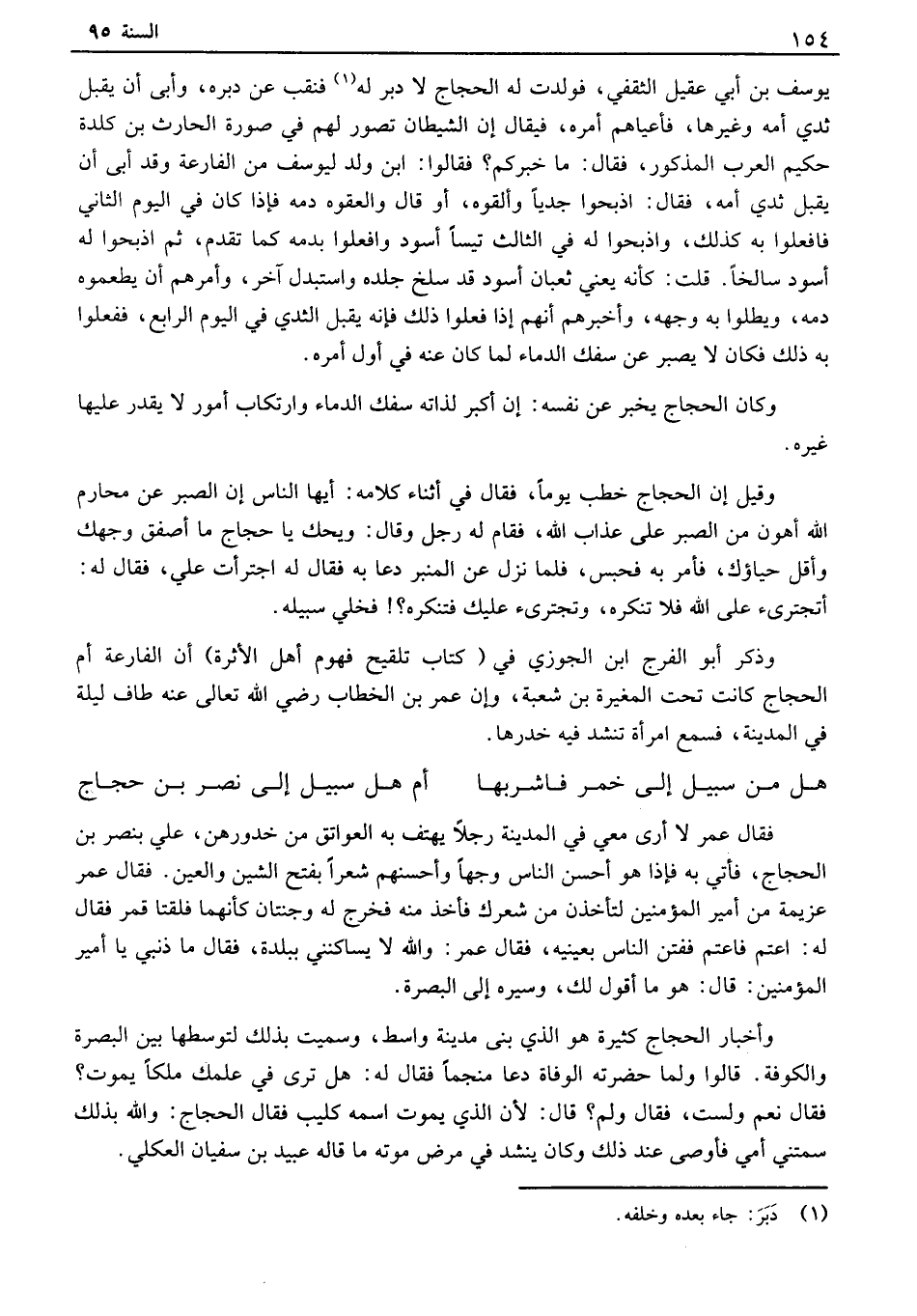 فقال عمر لا أرى معي في المدينة رجلاً يهتف به العواتق من خدورهن، علي بنصر بن الحجاج، فأتي به فإذا هو أحسن الناس وجهاً وأحسنهم شعراً بفتح الشين والعين. فقال عمر عزيمة من أمير المؤمنين لتأخذن من شعرك فأخذ منه فخرج له وجنتان كأنهما فلقتا قمر فقال له: اعتم فاعتم ففتن الناس بعينيه، فقال عمر: والله لا يساكنني ببلدة، فقال ما ذنبي يا أمير المؤمنين: قال: هو ما أقول لك، وسيره إلى البصرة. وأخبار الحجاج كثيرة هو الذي بنى مدينة واسط، وسميت بذلك لتوسطها بين البصرة والكوفة. قالوا ولما حضرته الوفاة دعا منجماً فقال له: هل ترى في علمك ملكاً يموت؟ فقال نعم ولست، فقال ولم؟ قالط: لأن الذي يموت اسمه كليب فقال الحجاج: والله بذلك سمتني أمي فأوصى عند ذلك وكان ينشد في مرض موته ما قاله عبيد بن سفيان العكلي.