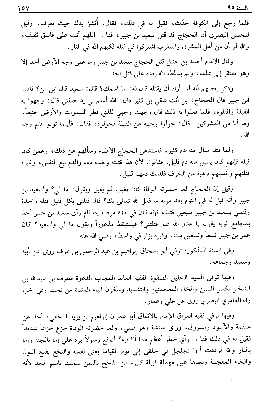 فلما رجع إلى الكوفة حدث، فقيل له في ذلك، فقال: انشر يدك حيث تعرف، وقيل للحسن البصري أن الحجاج قد قتل سعيد بن جبير، فقال: اللهم أنت على فاسق ثقيف، والله لو أن من أهل المشرق والمغرب اشتركوا في قتله لكبهم الله في النار. وقال الإمام أحمد بن حنبل قتل الحجاج سعيد بن جبير وما على وجه الأرض أحد إلا وهو مفتقر إلى علمه، ولم يسلطه الله بعده على قتل أحد. وذكر بعضهم أنه لما أراد أن يقتله قال له: ما اسمك. قال: سعيد قال ابن من؟ قال: ابن جبير قال الحجاج: بل أنت شقي بن كثير قال: الله أعلم بي إذ خلقني قال: وجهوا به القبلة واقتلوه، فلما فعلوا به ذلك قال وجهت وجهي للذي فطر السموات والأرض حنيفاً، وما أنا من المشركين. قال: حولوا وجهه عن القبلة فحولوه، فقال: فأينما تولوا فثم وجه الله. ولما قتله سال منه دم كثير، فاستدعى الحجاج الأطباء وسألهم عن ذلك، وعمن كان قبله فإنهم كان يسيل منه دم قليل، فقالوا: لأن هذا قتلته ونفسه معه والدم تبع النفس، وغيره قتلتهم وأنفسهم ذاهبة من الخوف فلذلك دمهم قليل. وقيل إن الحجاج لما حضرته الوفاة كان يغيب ثم يفيق ويقول: ما لي؟ ولسعيد بن جبير وأنه قيل له في النوم بعد موته ما فعل الله تعالى بك؟ قال قتلني بكل قتيل قتلة واحدة وقتلني بسعيد بن جبير سبعين قتلة، فإنه كان في مدة مرضه إذا نام رأى سعيد بن جبير أخذ بمجامع ثوبه يقول يا عدو الله فبم قتلتني؟ فيستيقظ مذعوراً ويقول ما لي ولسعيد؟ كان عمر بن جبير تسعاً وتسعين سنة، وقبره يزار في واسط، رضي الله عنه. وفي السنة المذكورة توفي أبو إسحاق ابراهيم بن عبد الرحمن بن عوف روى عن أبيه وسعيد وجماعة. وفيها توفي السيد الجليل الصفوة الفقيه العابد المجاب الدعوة مطرف بن عبد الله بن الشخير بكسر الشين والخاء المعجمتين والتشديد وسكون الياء المثناة من تحت وفي آخره راء العامري البصري روى عن علي وعمار. وفيها توفي فقيه العراق الإمام بالاتفاق أبو عمران ابراهيم بن يزيد النخعي، اخذ عن علقمة والأسود ومسروق، ورأى عائشة وهو صبي، ولما حضرته الوفاة جزع جزعاً شديداً فقيل له في ذلك فقال: وأي خطر أعظم مما أنا فيه؟ أتوقع رسولاً يرد علي إما بالجنة وأما بالنار والله لوددت أنها تجلجل في حلقي إلى يوم القيامة يعني نفسه والنخع بفتح النون والخاء المعجمة وبعدها عين مهملة قبيلة كبيرة من مذحج باليمن سميت باسم الجد لأنه
