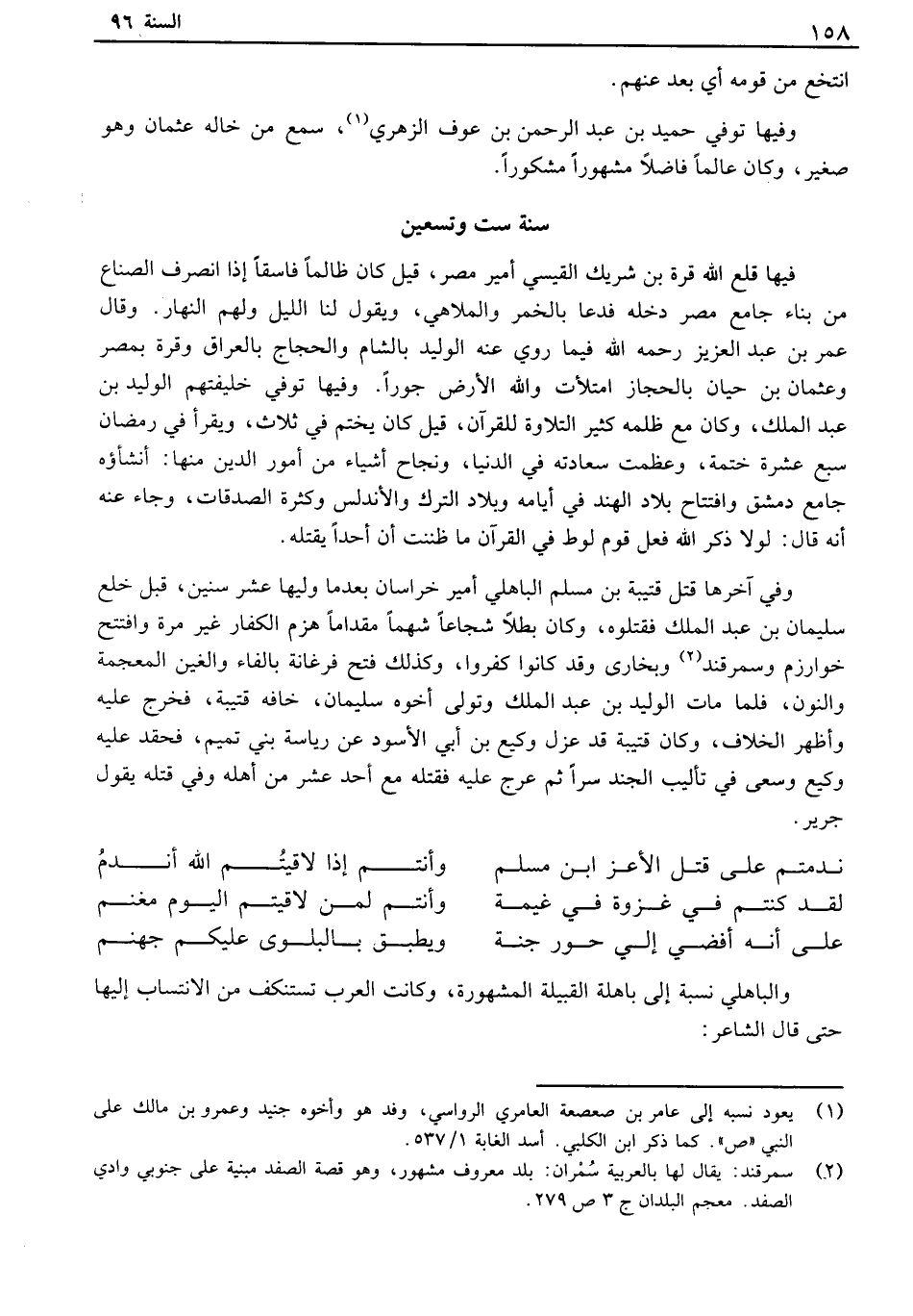 فيها قلع الله قرة بن شريك القيسي أمير مصر، قيل كان ظالماً فاسقاً إذا انصرف الصناع من بناء جامع مصر دخله فدعا بالخمر والملاهي، ويقول لنا الليل ولهم النهار. وقال عمر بن عبد العزيز رحمه الله فيما روي عنه الوليد بالشام والحجاج بالعراق وقرة بمصر وعثمان بن حيان بالحجاز امتلأت والله الأرض جوراً. وفيها توفي خليفتهم الوليد بن عبد الملك، وكان مع ظلمه كثير التلاوة للقرآن، قيل كان يختم في ثلاث، ويقرأ في رمضان سبع عشرة ختمة، وعظمت سعادته في الدنيا، ونجاح أشياء من أمور الدين منها: أنشأؤه جامع دمشق وافتتاح بلاد الهند في أيامه وبلاد الترك والأندلس وكثرة الصدقات، وجاء عنه أنه قال: لولا ذكر الله فعل قوم لوط في القرآن ما ظننت أن أحداً يقتله. وفي آخرها قتل قتيبة بن مسلم الباهلي أمير خراسان بعدما وليها عشر سنين، قبل خلع سليمان بن عبد الملك فقتلوه، وكان بطلاً شجاعاً شهماً مقداماً هزم الكفار غير مرة وافتتح خوارزم وسمرقند وبخارى وقد كانوا كفروا، وكذلك فتح فرغانة بالفاء والغين المعجمة والنون، فلما مات الوليد بن عبد الملك وتولى أخوه سليمان، خافه قتيبة، فخرج عليه وأظهر الخلاف، وكان قتيبة قد عزل وكيع بن أبي الأسود عن رياسة بني تميم، فحقد عليه وكيع وسعى في تأليب الجند سراً ثم عرج عليه فقتله مع أحد عشر من أهله وفي قتله يقول جرير.