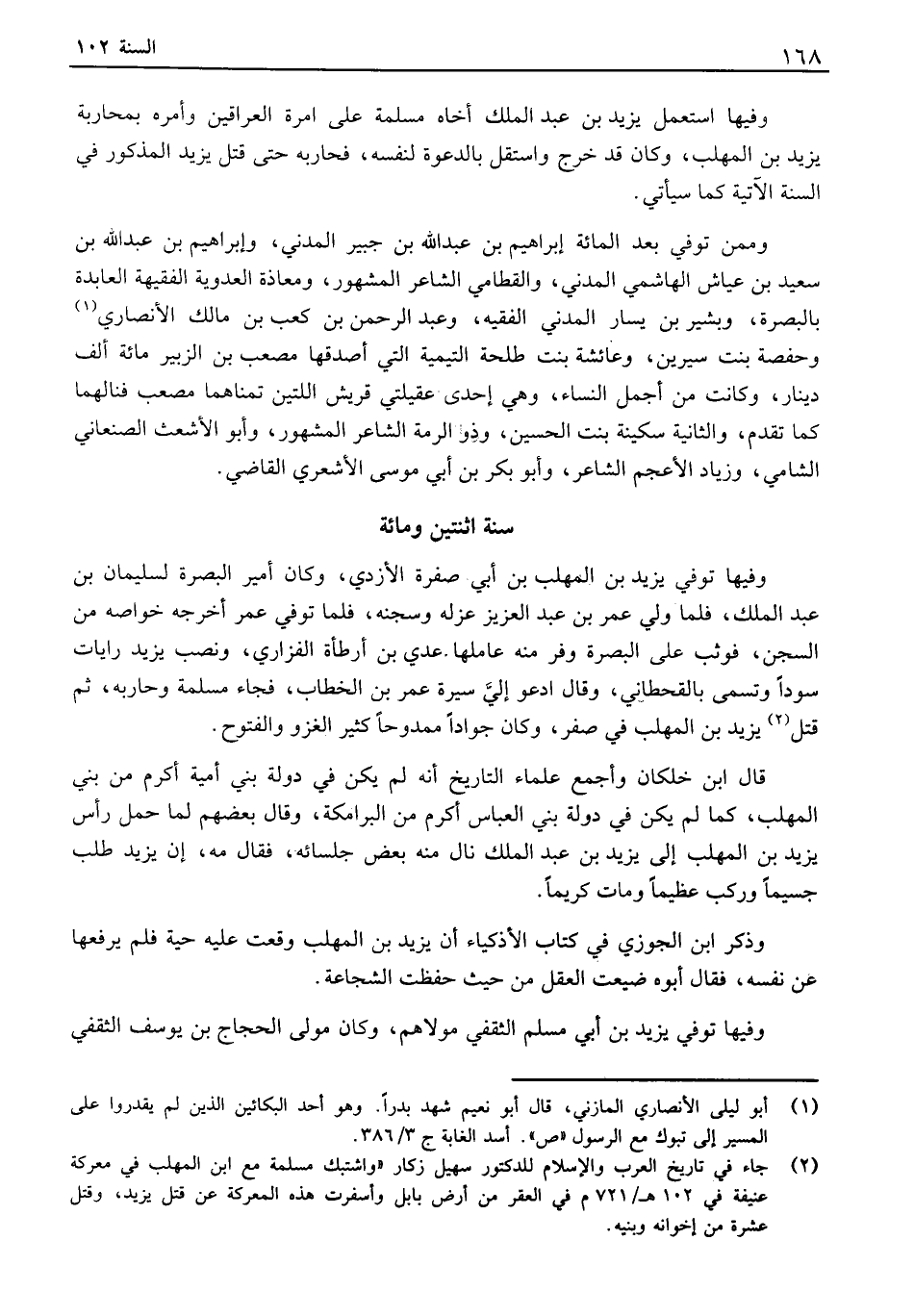 وفيها استعمل يزيد بن عبد الملك أخاه مسلمة على امرة العراقين وأمره بمحاربة يزيد بن المهلب، وكان قد خرج واستقل بالدعوة لنفسه، فحاربه حتى قتل يزيد المذكور في السنة الآتية كما سيأتي. وممن توفي بعد المائة ابراهيم بن عبد الله بن جبير المدني، وابراهيم بن عبد الله بن سعيد بن عياش الهاشمي المدني، والقطامي الشاعر المشهور، ومعاذة العدوية الفقيهة العابدة بالبصرة، وبشير بن يسار المدني الفقيه، وعبد الرحمن بن كعب بن مالك الأنصاري وحفصة بنت سيرين، وعائشة بنت طلحة التيمية التي أصدقها مصعب بن الزبير مائة ألف دينار، وكانت من أجمل النساء، وهي إحدى عقيلتي قريش اللتين تمناهما مصعب فنالهما كما تقدم، والثانية سكينة بنت الحسين، وذو الرمةالشاعر المشهور، وأبو الأشعث الصنعاني الشامي، وزياد الأعجم الشاعر، وأبو بكر بن أبي موسى الأشعري القاضي.