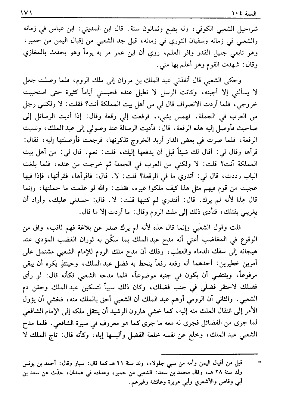 شراحيل السعبي الكوفي، وله بضع وثمانون سنة. قال ابن المديني: ابن عباس في زمانه والشعبي في زمانه وسفيان الثوري في زمانه، قيل جد الشعبي من إقبال اليمن من حمير، وهو تابعي جليل القدر وافي العلم، روي أن ابن عمر مر به يوماً وهو يحدث بالمغازي وقال: شهدت القوم وهو أعلم بها مني. وحكى الشعبي قال أنفذني عبد الملك بن مروان إلى ملك الروم، فلما وصلت جعل لا يسألني إلا أجبته، وكانت الرسل لا تطيل عنده فحبسني أياماً كثيرة حتى استحببت خروجي، فلما أردت الانصراف قال لي من أهل بيت المملكة أنت؟ فقلت: لا ولكنني رجل من العرب في الجملة، فهمس بشيء، فرفعت إلي رقعة وقال: اذا أديت الرسائل إلى صاحبك فأوصل إليه هذه الرقعة، قال: فأديت الرسالة عند وصولي إلى عبد الملك، ونسيت الرقعة، فلما صرت في بعض الدار أريد الخروج تذكرتها، فرجعت فأوصلتها إليه، فقال: قرأها وقال لي: اقال لك شيئاً قبل أن يدفعها إليك، قلت: نعم. قال لي: من أهل بيت المملكة أنت؟ قلت: لا ولكني من العرب في الجملة ثم خرجت من عنده، فلما بلغت الباب رددت، قال لي: اتدري ما في الرقعة؟ قلت: لا. قال: فاقرأها، فقرأتها، فإذا فيها عجبت من قوم فيهم مثل هذا كيف ملكوا غيره، فقلت: والله لو علمت ما حملتها، وإنما قال هذا لأنه لم يرك. قال: افتدري لم كتبها قلت: لا. قال: حسدني عليك، وأراد أن يغريني بقتلك، فتأدى ذلك إلى ملك الروم وقال: ما أردت إلا ما قال. قلت وقول الشعبي وإنما قال هذه لأنه لم يرك صدر عن بلاغة فهم ثاقب، واق من الوقوع في المغاضب أعني أنه مدح عبد الملك بما سكن به ثوران الغضب المؤدي عنذ هيجانه إلى سفك الدماء والعطب، وذلك أن مدح ملك الروم للإمام الشعبي مشتمل على أمرين خطيرين: احدهما أنه رفعه رفعاً ينحط به فضل عبد الملك، وحينئذ يكره أن يبقى مرفوعاً، ويقتضي أن يكون في جنبه موضوعاً، فلما مدحه الشعبي فكأنه قال: لو رأى فضلك لاحتقر فضلي في جنب فضلك، وكان ذلك سبباً لتسكين عبد الملك وحقن دم الشعبي. والثاني أن الرومي أوهم عبد الملك أن الشعبي أحق بالملك منه، فخشي أن يؤول الأمر إلى انتقال الملك منه إليه، كما خشي هارون الرشيد أن ينتقل ملكه إلى الأمام الشافعي لما جرى من الفضائل فجرى له معه ما جرى كما هو معررف في سيرة الشافعي. فلما مدح الشعبي عبد الملك، وخلع عن نفسه خلعة الفضل وألبسها إياه، وكأنه قال: تاج الملك لا
