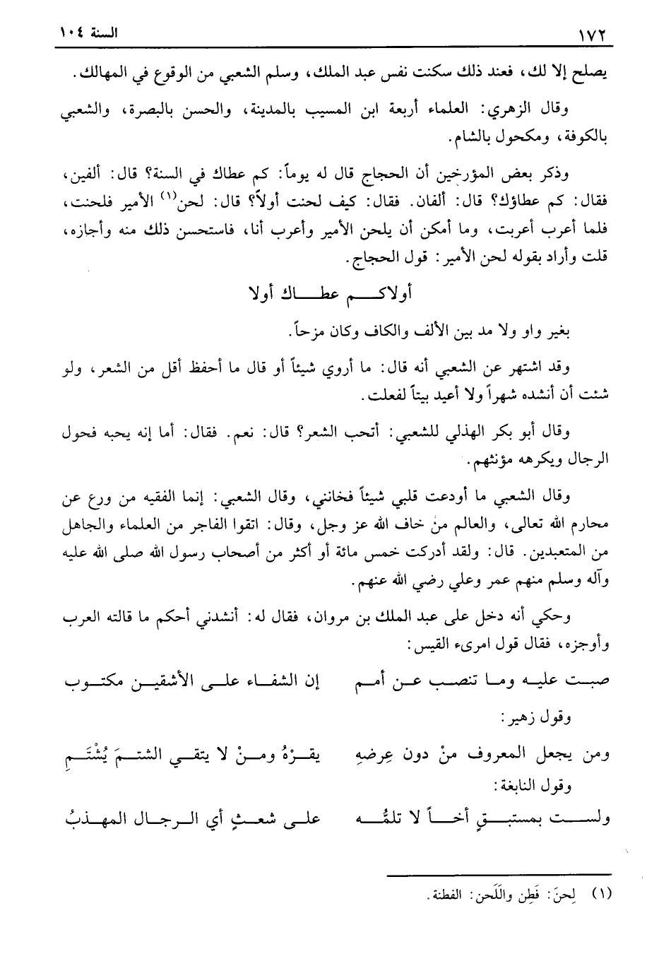 يصلح إلا لك، فعند ذلك سحكنت نفس عبد الملك، وسلم الشعبي من الوقوع في المهالك. وقال الزهري: العلماء أربعة ابن المسيب بالمدينة، والحسن بالبصرة، والشعبي بالكوفة، ومكحول بالشام. وذكر بعض المؤريخين أن الحجاج قال له يوماً: كم عطاك في السنة؟ قال: الفين، فقال: كم عطاؤك؟ قال: الفان. فقال: كيف لحنت أولاً؟ قال: لحن الأمير فلحنت، فلما أعرب أعربت، وما أمكن أن يلحن الأمير وأعرب أنا، فاستحسن ذلك منه وأجازه، قلت وأراد بقوله لحن الأمير: قول الحجاج.
