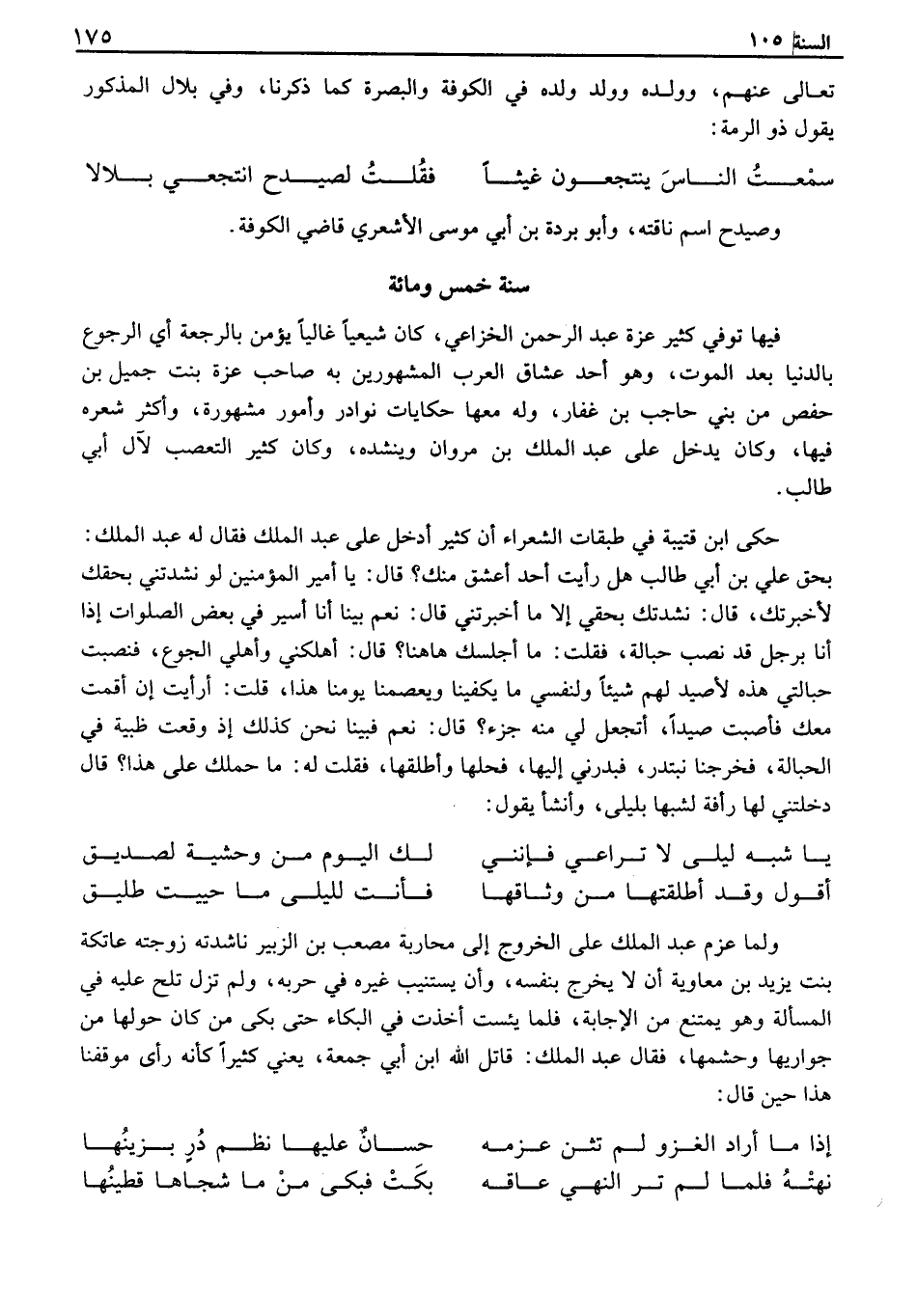 فيها توفي كثيرعزة عبد الرحمن الخزاعي، كان شيعياً غالياً يؤمن بالرجوع بالدنيا بعد الموت، وهو أحد عشاق العرب المشهورين به صاحب عزة بنت جميل بن حفص من بني حاجب بن غفار، وله معها حكايات نوادر وأمور مشهورة، وأكثر شعره فيها، وكان يدخل على عبد الملك بن مروان وينشده، وكان كثير التعصب لآل طالب. حكى ابن قتيبة في طبقات الشعراء أن كثير أدخل على عبد الملك فقال له عبد الملك: بحق علي بن أبي طالب هل رأيت أحد أعشق منك؟ قال: يا أمير المؤمنين لو نشدتني بحقك لأخبرتك، قال: نشدتك بحقي إلا ما أخبرتني قال: نعم بينا أنا أسير في بعض الصلوات أذا أنا برجل قد نصب حبالة، فقلت: ما أجلسك هاهنا؟ قال: اهلكني وأهلي الجوع، فنصبت حبالتي هذه لأصيد لهم شيئاً ولنفسي ما يكفينا ويعصمنا يومنا هذا، قلت: ارأيت إن أقمت معك فأصبت صيداً، اتجعل لي منه جزء؟ قال: نعم فبينا نحن كذلك إذ وقعت ظبية في الحبالة، فخرجنا نبتدر، فبدرني إليها، فحلها وأطلقها، فقلت له: ما حملك على هذا؟ قال دخلتني لها رأفة لشبها بليلى، وأنشأ يقول: