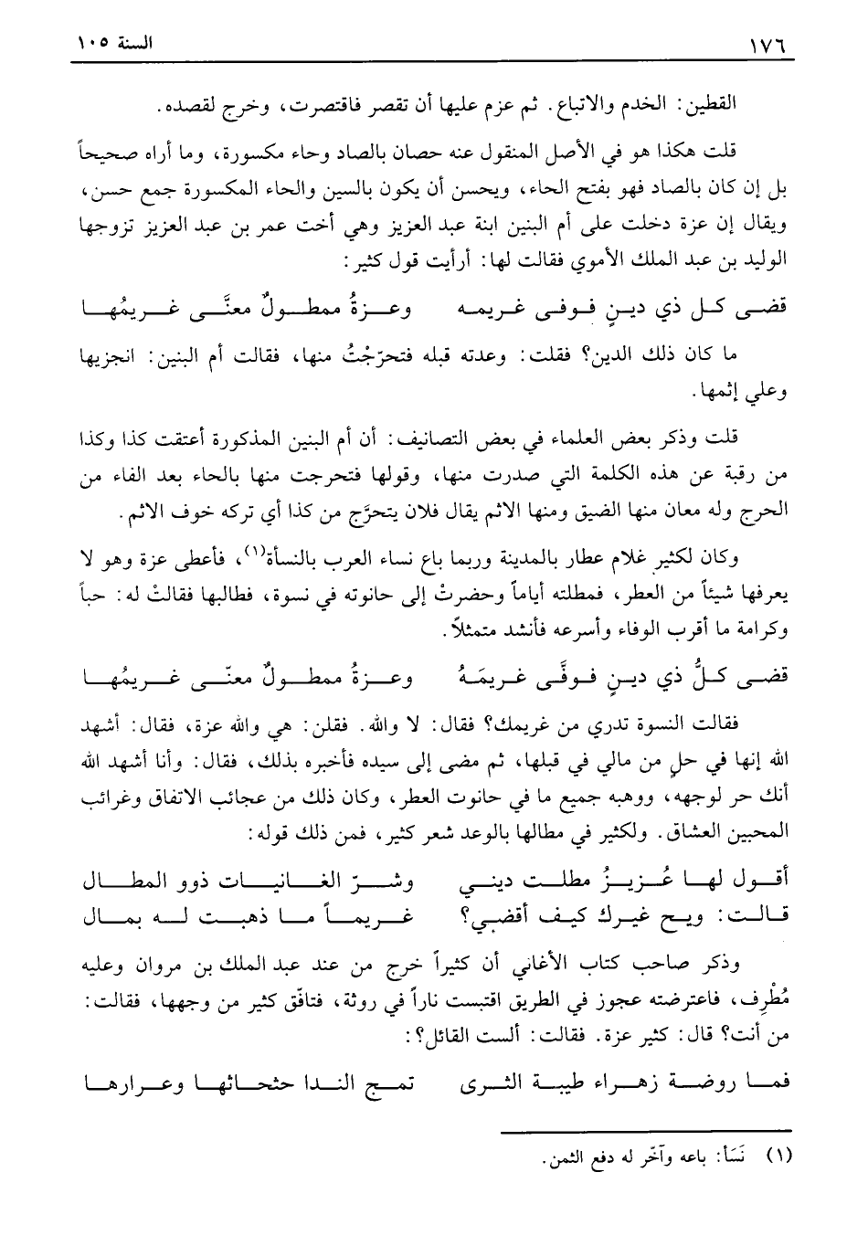 القطين: الخدم والاتباع. ثم عزم عليها أن تقصر فاقتصرت، وخرج لقصده. قلت هكذا هو في الأصل المنقول عنه حصان بالصاد وحاء مكسورة، وما أراه صحيحاً بل إن كان بالصاد فهو بفتح الحاء، ويحسن أن يكون بالسين والحاء المكسورة جمع حسن، ويقال إن عزة دخلت على أم البنين ابنة عبد العزيز وهي أخت عمر بن عبد العزيز تزوجها الوليد بن عبد الملك الأموي فقالت لها: ارأيت قول كثير: