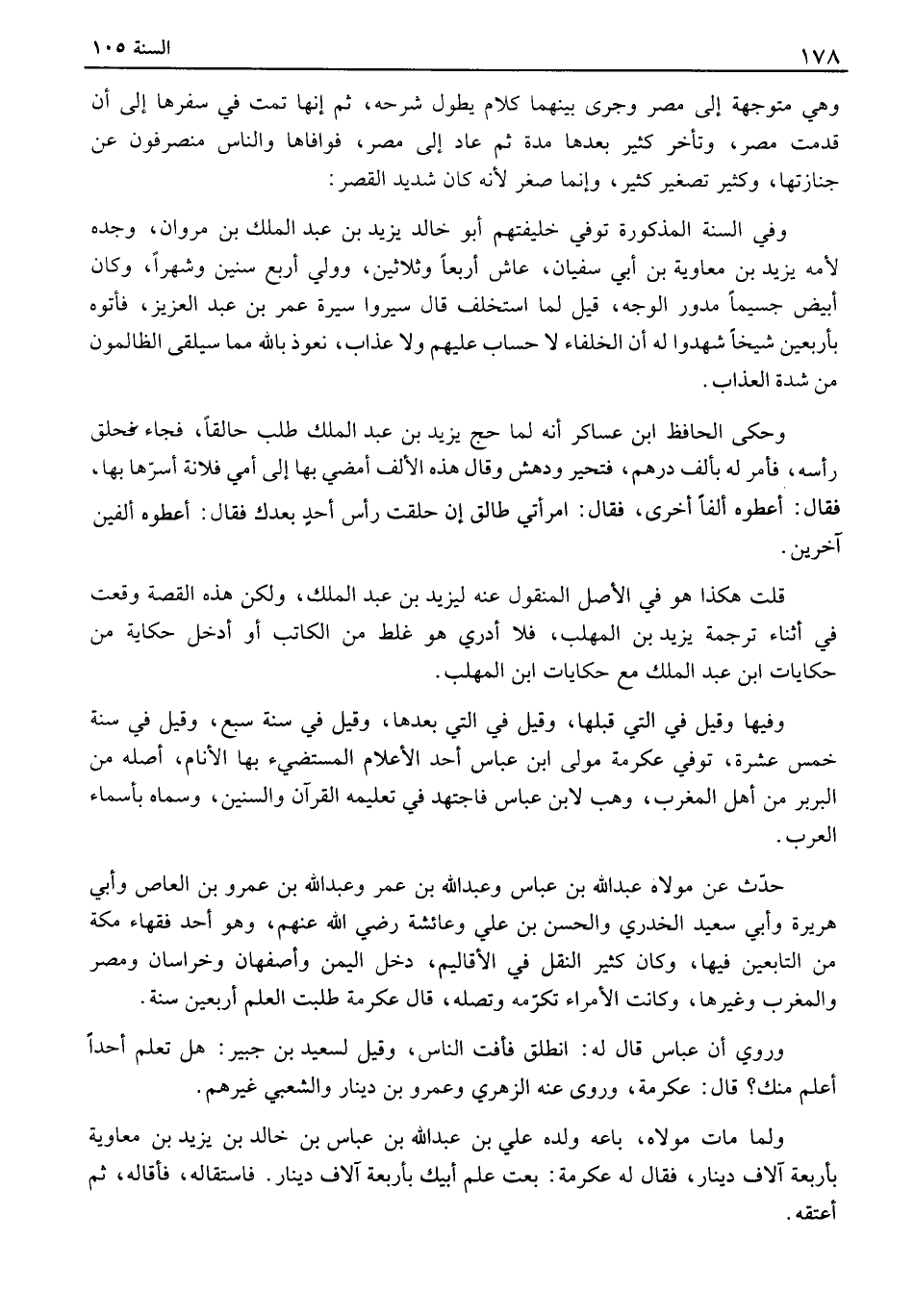 وهي متوجهه إلى مصر وجرى بينهما كلام يطول شرحه، ثم إنها تمت في سفرها إلى أن قدمت مصر، وتأخر كثير بعدها مدة ثم عاد إلى مصر، فوفاها والناس منصرفون عن جنازتها، وكثير تصغير كثير، وإنما صغر لأنه كان شديد القصر: وفي السنة المذكورة توفي خليفتهم أبو خالد يزيد بن عبد الملك بن مروان، وجده لأمه يزيد بن معاوية بن أبي سفيان، عاش أربعاً وثلاثين، وولي أربع سنين وشهراً، وكان أبيض جسيماً مدور الوجه، قيل لما استخلف قال سيروا سيرة عمر بن عبد العزيز، فأتوه بأربعين شيخاً شهدوا له أن الخلفاء لا حساب عليهم ولا عذاب، نعوذ بالله مما سيلقى الظالمون من شدة العذاب. وحكى الحافظ ابن عساكر أنه لما حج يزيد بن عبد الملك طلب حالقاً، فجاء فحلق رأسه، فأمر له بألف درهم، فتحير ودهش وقال هذه الألف أمضي بها إلى أمي فلانة أسرها بها، فقال: اعطوه ألفاً أخرى، فقال: امرأتي طالق إن حلقت رأس أحد بعدك فقال: اعطوه ألفين آخرين. قلت هكذا هو في الأصل المنقول عنه ليزيد بن عبد الملك، ولكن هذه القصة وقعت في أثناء ترجمة يزيد بن المهلب، فلا أدري هو غلط من الكاتب أو أدخل حكاية من حكايات ابن عبد الملك مع حكايات ابن المهلب. وفيها وقيل في التي قبلها، وقيل في التي بعدها، وقيل في سنة سبع، وقيل في سنة خمس عشرة، توفي عكرمة مولى ابن عباس أحد الأعلام المستضيء بها الأنام، اصله من البربر من أهل المغرب، وهب لابن عباس فاجتهد في تعليمه القرآن والسنين، وسماه بأسماء العرب. حدث عن مولاه عبد الله بن عباس وعبد الله بن عمر وعبد الله بن عمرو بن العاص وأبي هريرة وأبي سعيد الخدري والحسن بن علي وعائشة رضي الله عنهم، وهو أحد فقهاء مكة من التابعين فيها، وكان كثير النقل في الأقاليم، خل اليمن وأصفهان وخراسان ومصر والمغرب وغيرها، وكانت الأمراء تكرمه وتصله، قال عكرمة طلبت العلم أربعين سنة. وروي أن عباس قال له: انطلق فأفت الناس، وقيل لسعيد بن جبير: هل تعلم أحداً أعلم منك؟ قال: عكرمة، وروى عنه الزهري وعمرو بن دينار والشعبي غيرهم. ولما مات مولاه، باعه ولده علي بن عبد الله بن عباس بن خالد بن يزيد بن معاوية بأربعة آلاف دينار، فقال له عكرمة: بعت علم أبيك بأربعة آلاف دينار. فاستقاله، فأقاله، ثم أعتقه.