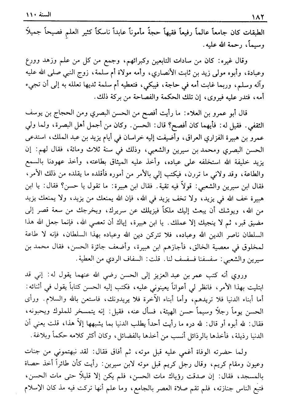 الطبقات كان جامعاً عالماً رفيعاً فقيهاً حجة مأموناً عابداً ناسكاً كثير العلم فصيحاً جميلاً وسيماً، رحمة الله عليه. وقال غيره: كان من سادات التابعين وكبرائهم، وجمع من كل من علم وزهد وورع وعبادة، وأبوه مولى زيد بن ثابت الأنصاري، وأمه مولاة أم سلمة، زوج النبي صلى الله عليه وآله وسلم، وربما غابت أمه في حاجة، فيبكي، فتعطيه أم سلمة ثديها تعلله به إلى أن تجيء أمه، فتدر عليه فيروى، ان تلك الحكمة والفصاحة من بركة ذلك. قال أبو عمرو بن العلاء: ما رأيت أفصح من الحسن البصري ومن الحجاج بن يوسف الثقفي. فقيل له: فأيهما كان أفصح؟ قال: الحسن. وكان من أجمل أهل البصرة، ولما ولي عمرو بن هبيرة الفزاري العراق، وأضيفت إليه خراسان في أيام يزيد بن عبد الملك، استدعى الحسن البصري ومحمد بن سيرين والشعبي، وذلك في سنة ثلاث ومائة، فقال لهم: ان يزيد خليفة الله استخلفه على عباده، وأخذ عليه الميثاق بطاعته، وأخذ عهودنا بالسمع والطاعة، وقد ولاني ما ترون، فيكتب إلي بالأمر من أموره فأقلده ما يقلده من ذلك الأمر، فقال ابن سيرين والشعبي: قولاً فيه تقية. فقال ابن هبيرة: ما تقول يا حسن؟ فقال: يا ابن هبيرة خف الله في يزيد، ولا تخف يزيد في الله، فإن الله يمنعك من يزيد، ولا يمنعك يزيد من الله، ويوشك أن يبعث إليك ملكاً فيزيلك عن سريرك، ويخرجك من سعة قصر إلى مضيق قبر، ثم لا ينجيك إلا عملك. يا ابن هبيرة، اياك أن تعصي الله، فإنما جعل الله هذا السلطان ناصر الدين الله وعباده، فلا تتركن دين الله وعباده بهذا السلطان، فإنه لا طاعة لمخلوق في معصية الخالق، فأجازهم ابن هبيرة، وأضعف جائزة الحسن، فقال محمد بن سيرين والشعبي: سفسفنا فسفسف لنا. قلت: السفاف الردي من العطية. وروي أنه كتب عمربن عبد العزيز إلى الحسن رضي الله عنهما يقول له: اني قد ابتليت بهذا الأمر، فانظر لي أعواناً يعينوني عليه، فكتب إليه الحسن كتاباً يقول في أثنائه: اما أبناء الدنيا فلا تريدهم، وأما أبناء الآخرة فلا يريدونك، فاستعن بالله والسلام. ورأى الحسن يوماً رجلاً وسيماً حسن الهيئة، فسأل عنه، فقيل: انه يتمسخر للملوك ويحبونه، فقال: لله أبوه أو قال: لله دره ما رأيت أحداً يطلب الدنيا بما يشبهها إلا هذا، قلت يعني أن الدنيا رذيلة، فأخذها بالرذائل أنسب من أخذها بالفضائل، وكان أكثر كلامه حكماً وبلاغة. ولما حضرته الوفاة أغمي عليه قبل موته، ثم أفاق فقال: لقد نبهتموني من جنات وعيون ومقام كريم، وقال رجل كريم قبل موته لابن سيرين: رأيت كأن طائراً أخذ حصاة بالمسجد، فقال: ان صدقت رؤياك مات الحسن، فلم يكن إلا قليلاً حتى مات الحسن، فتبع الناس جنازته، فلم تقم صلاة العصر بالجامع، وما علم أنها تركت فيه مذ كان الإسلام