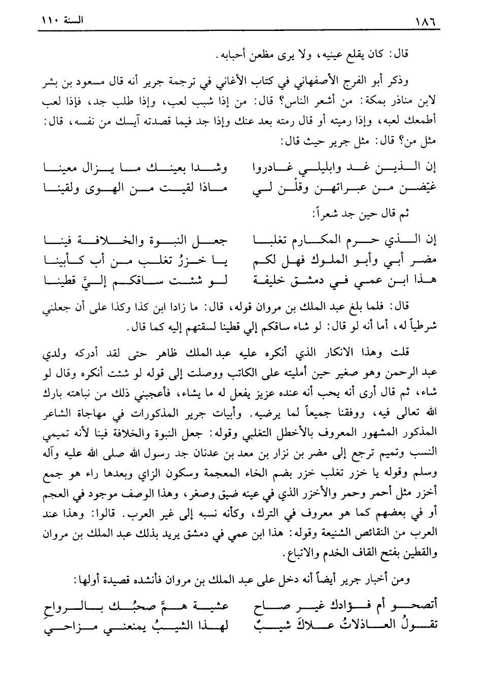 قال: فلما بلغ عبد الملك بن مروان قوله، قال: ما زادا ابن كذا وكذا على أن جعلني شرطياً له، اما أنه لو قال: لو شاء ساقكم إلي قطينا لسقتهم إليه كما قال. قلت وهنا الانكار الذي أنكره عليه عبد الملك ظاهر حتى لقد أدركه ولدي عبد الرحمن وهو صغير حين أمليته على الكاتب ووصلت إلى قوله لو شئت أنكره وقال لو شاء، ثم قال أرى أنه يحب أنه عنده عزيز يفعل له ما يشاء، فأعجبني ذلك من نباهته بارك الله تعالى فيه، ووفقنا جميعاً لما يرضيه. وأبيات جرير المذكورات في مهاجاة الشاعر المذكور المشهور المعروف بالأخطل التغلبي وقوله: جعل النبوة والخلافة فينا لأنه تميمي النسب وتميم ترجع إلى مضر بن نزار بن معد بن عدنان جد رسول الله صلى الله عليه وآله وسلم وقوله يا خزر تغلب خزر بضم الخاء المعجمة وسكون الزاي وبعدها راء هو جمع أخزر مثل أحمر وحمر والأخزر الذي في عينه ضيق وصغر، وهذا الوصف موجود في العجم أو في بعضهم كما هو معروف في الترك، وكأنه نسبه إلى غير العرب. قالوا: وهذا عند العرب من النقائص الشنيعة وقوله: هذا ابن عمي في دمشق يريد بذلك عبد الملك بن مروان والقطين بفتح القاف الخدم والاتباع.