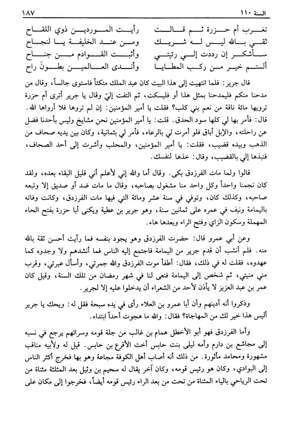 قال جرير: فلما انتهيت إلى هذا البيت كان عبد الملك متكئاً فاستوى جالساً، وقال من مدحنا منكم فليمدحنا بمثل هذا أو فليسكت، ثم التفت إلي وقال يا جرير أترى أم حزرة ترويها مائة ناقة من نعم بني كلب؟ فقلت يا أمير المؤمنين: ان لم تروها فلا أرواها الله. قال: فأمر بها لي كلها سود الحدق. قلت: يا أمير المؤمنين نحن مشايخ وليس بأحدنا فضل عن راحلته، والإبل أباق فلو أمرت لي بالرعاء، فأمر لي بثمانية، وكان بين يديه صحاف من الذهب وبيده قضيب، فقلت: يا أمير المؤمنين، والمحلب وأشرت إلى أحد الصحاف، فنبذها إلي بالقضيب، وقال: خذها لنفسك. قالوا ولما مات الفرزدق بكى. وقال أما والله إني لأعلم أني قليل البقاء بعده، ولقد كان نجمنا واحداً وكل واحد منا مشغول بصاحبه، وقال ما مات ضد أو صديق إلا وتبعه صاحبه، وكذلك كان، وتوفي في سنة عشر ومائة التي فيها مات الفرزدق، وكانت وفاته باليمامة ونيف في عمره على ثمانين سنة، وهو جرير بن عطية ويكنى أبا حزرة بفتح الحاء المهملة وسكون الزاي وفتح الراء وبعدها هاء. وعن أبي عمرو قال: حضرت الفرزدق وهو يجود بنفسه فما رأيت أحسن ثقة بالله منه. فلم أنشب أن قدم جرير من اليمامة فاجتمع إليه الناس فما أنشدهم ولا وجدوه كما عهدوه، فقلت له في ذلك، فقال: اطفأ موت الفرزرق والله جمرتي، وأسأل عبرتي، وقرب مني منيتي، ثم شخص إلى اليمامة فنعى لنا في شهر رمضان من تلك السنة، وقيل كان عمر بن عبد العزيز لا يأذن لأحد من الشعراء أن يدخلوا عليه إلا لجرير. وذكروا أنه أدينهم وأن أبا عمرو بن العلاء رأى في يده سبحة فقل له: ويحك يا جرير أليس هذا خير لك من المهاجاة؟ فقال: والله ما هجوت أحداً ابتداء. وأما الفرزدق فهو أبو الأخطل همام بن غالب من جلة قومه وسراتهم يرجع في نسبه إلى مجاشع بن دارم وأمه ليلى بنت حابس أخت الأقرع بن حابس. قيل له ولأبيه مناقب مشهورة ومحامد مأثورة. من ذلك أنه أصاب أهل الكوفة مجاعة وهو بها فخرج أكثر الناس إلى البوادي، وكان هو رئيس قومه، وكان آخر يقال له سحيم بن وثيل بعد المثلثة مثناة من تحت الرياحي بالياء المثناة من تحت من بعد الراء رئيس قومه أيضاً، فخرجوا إلى مكان على