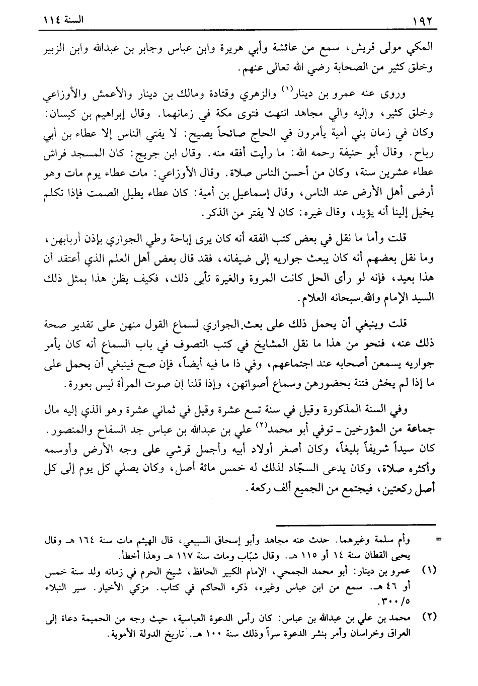 المكي مولى قريش، سمع من عائشة وأبي هريره وابن عباس وجابر بن عبد الله وابن الزبير وخلق كثير من الصحابة رضي الله تعالى عنهم. وروى عنه عمرو بن دينار والزهري وقتادة ومالك بن دينار والأعمش والأوزاعي وخلق كثير، وإليه والي مجاهد انتهت فتوى مكة في زمانهما. وقال إبراهيم بن كيسان: وكان في زمان بني أمية يأمرون في الحاج صائحاً يصيح: لا يفتي الناس إلا عطاء بن أبي رباح. وقال أبو حنيفة رحمه الله: ما رأيت أفقه منه. وقال ابن جريج: كان المسجد فراش عطاء عشرين سنة، وكان من أحسن الناس صلاة. وقال الأوزاعي: مات عطاء يوم مات وهو أرضى أهل الأرض عند الناس، وقال إسماعيل بن أمية: كان عطاء يطيل الصمت فإذا تكلم يخيل إلينا أنه يؤيد، وقال غيره: كان لا يفتر من الذكر. قلت وأما ما نقل في بعض كتب الفقه أنه كان يرى إباحة وطي الجواري بإذن أربابهن، وما نقل بعضهم أنه كان يبعث جواريه إلى ضيفانه، فقد قال بعض أهل العلم الذي أعتقد أن هذا بعيد، فإنه لو رأى الحل كانت المروة والغيرة تأبى ذلك، فكيف يظن هذا بمثل ذلك السيد الإمام والله. سبحانه العلام. قلت وينبغي أن يحمل ذلك على بعث الجواري لسماع القول منهن على تقدير صحة ذلك عنه، فنحو من هذا ما نقل المشايخ في كتب التصوف في باب السماع أنه كان يأمر جواريه يسمعن أصحابه عند اجتماعهم، وفي ذا ما فيه أيضاً، فإن صح فينبغي أن يحمل على ما إذا لم يخش فتنة بحضورهن وسماع أصواتهن، وإذا قلنا إن صوت المرأة ليس بعورة. وفي السنة المذكورة وقيل في سنة تسع عشرة وقيل في ثماني عشرة وهو الذي إليه مال