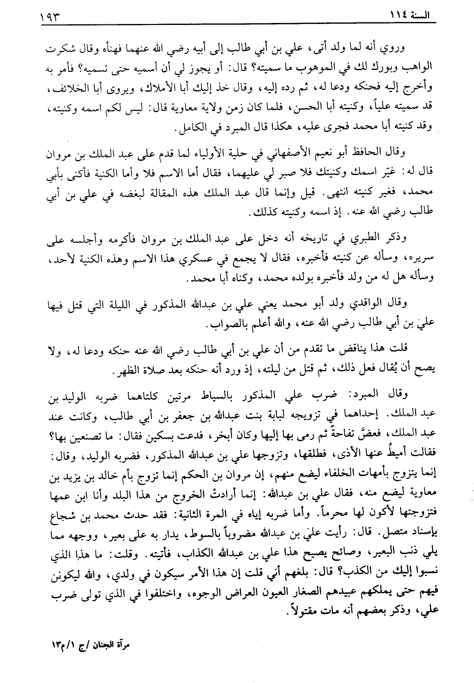 وروي أنه لما ولد أتى، علي بن أبي طالب إلى أبيه رضي الله عنهما فهنأه وقال شكرت الواهب وبورك لك في الموهوب ما سميته؟ قال: او يجوز لي أن أسميه حتى تسميه؟ فأمر به وأخرج إليه فحنكه ودعا له، ثم رده إليه، وقال خذ إليك أبا الأملاك، ويروى أبا الخلائف، قد سميته علياً، وكنيته أبا الحسن، فلما كان زمن ولاية معاوية قال: ليس لكم اسمه وكنيته، وقد كنيته أبا محمد فجرى عليه، هكذا قال المبرد في الكامل. وقال الحافظ أبو نعيم الأصفهاني في حلية الأولياء لما قدم على عبد الملك بن مروان قال له: غير اسمك وكنيتك فلا صبر لي عليهما، فقال أما الاسم فلا وأما الكنية فأكنى بأبي محمد، فغير كنيته انتهى. قيل وإنما قال عبد الملك هذه المقالة لبغضه في علي بن أبي طالب رضي الله عنه. إذ اسمه وكنيته كذلك. وذكر الطبري في تاريخه أنه دخل على عبد الملك بن مروان فأكرمه وأجلسه على سريره، وسأله عن كنيته فأخبره، فقال لا يجمع في عسكري هذا الاسم وهذه الكنية لأحد، وسأله هل له من ولد فأخبره بولده محمد، وكناه أبا محمد. وقال الواقدي ولد أبو محمد يعني علي بن عبد الله المذكور في الليلة التي قتل فيها علي بن أبي طالب رضي الله عنه، والله أعلم بالصواب. قلت هذا يناقض ما تقدم من أن علي بن أبي طالب رضي الله عنه حنكه ودعا له، ولا يصح أن يقال فعل ذلك، ثم قتل من ليلته، اذ ورد أنه حنكه بعد صلاة الظهر. وقال المبرد: ضرب علي المذكور بالسياط مرتين كلتاهما ضربه الوليد بن عبد الملك. إحداهما في تزويجه لبابة بنت عبد الله بن جعفر بن أبي طالب، وكانت عند عبد الملك، فعض تفاحة ثم رمى بها إليها وكان أبخر، فدعت بسكين فقال: ما تصنعين بها؟ فقالت أميط عنها الأذى، فطلقها، وتزوجها علي بن عبد الله المذكور، فضربه الوليد، وقال: انما يتزوج بأمهات الخلفاء ليضع منهم، ان مروان بن الحكم إنما تزوج بأم خالد بن يزيد بن معاوية ليضع منه، فقال علي بن عبد الله: انما أرادت الخروج من هذا البلد وأنا ابن عمها فتزوجتها لأكون لها محرماً. وأما ضربه إياه في المرة الثانية: فقد حدث محمد بن شجاع بإسناد متصل. قال: رأيت علي بن عبد الله مضروباً بالسوط، يدار به على بعير، ووجهه مما يلي ذنب البعير، وصائح يصيح هذا علي بن عبد الله الكذاب، فأتيته. وقلت: ما هذا الذي نسبوا إليك من الكذب؟ قال: بلغهم أني قلت إن هذا الأمر سيكون في ولدي، والله ليكونن فيهم حتى يملكهم عبيدهم الصغار العيون العراض الوجوه، واختلفوا في الذي تولى ضرب علي، وذكر بعضهم أنه مات مقتولاً.