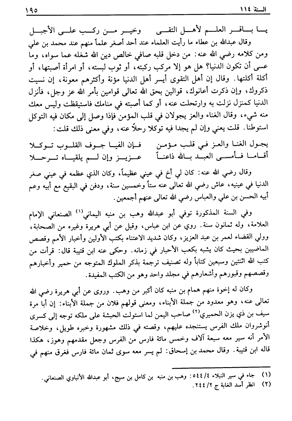 وفي السنة المذكورة توفي أبو عبد الله وهب بن منبه اليماني الصنعاني الإمام العلامة، وله ثمانون سنة. روي عن ابن عباس، وقيل عن أبي هريرة وغيره من الصحابة، وولي القضاء لعمر بن عبد العزيز، وكان شديد الاعتناء بكتب الأولين وأخبار الأمم وقصص الماضيين بحيث كان يشبه بكعب الأحبار في زمانه. وحكى عنه ابن قتيبة قال: قرأت من كتب الله اثنتين وسبعين كتاباً وله تصنيف ترجمة بذكر الملوك المتوجه من حمير وأخبارهم وقصصهم وقبورهم وأشعارهم في مجلد واحد وهو من الكتب المفيدة. وكان له إخوة منهم همام بن منبه كان أكبر من وهب. وروى عن أبي هريرة رضي الله