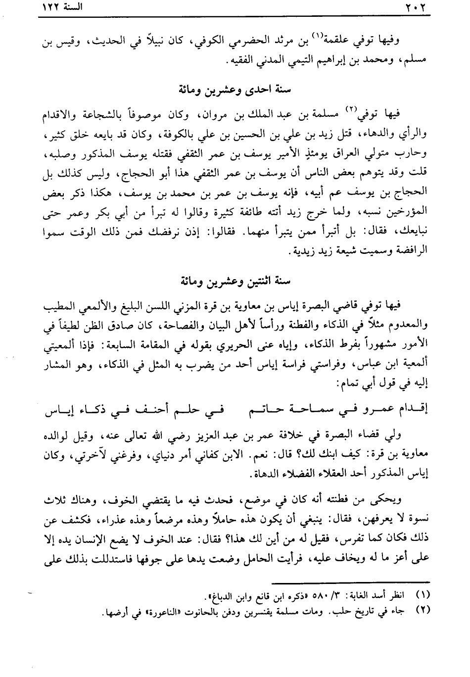 فيها توفي قاضي البصرة إياس بن معاوية بن قرة المزني اللسن البليغ والألمعي المطيب والمعدوم مثلاً في الذكاء والفطنة ورأساً لأهل البيان والفصاحة، كان صادق الظن لطيفاً في الأمور مشهوراً بفرط الذكاء، وإياه عنى الحريري بقوله في المقامة السابعة: فإذا ألمعيتي ألمعية ابن عباس، وفراستي فراسة إياس أحد من يضرب به المثل في الذكاء، وهو المشار إليه في قول أبي تمام: