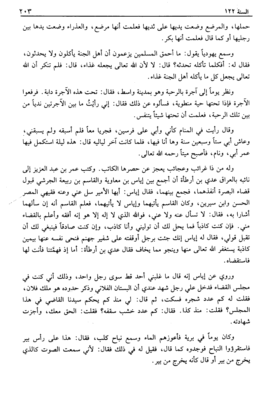 حملها، والمرضع وضعت يديها على ثديها فعلمت أنها مرضع، والعذراء وضعت يدها بين رجليها أوكما قال فعلمت أنها بكر. وسمع يهودياً يقول: ما أحمق المسلمين يزعمون أن أهل الجنة يأكلون ولا يحدثون، فقال له: افكلما تأكله تحدثه؟ قال: لا لأن الله تعالى يجعله غذاء، قال: فلم تنكر أن تعالى يجعل كل ما يأكله أهل الجنة غذاء. ونظر يوماً إلى آجرة بالرحبة وهو بمدينة واسط، فقال: تحت هذه الآجرة دابة. فرفعوا الآجرة فإذا تحتها حية منطوية، فسألوه عن ذلك فقال: اني رأيت ما بين الآجرتين ندياً من بين تلك الرحبة، فعلمت أن تحتها شيئاً يتنفس. وقال رأيت في المنام كأني وأبي على فرسين، فجريا معاً فلم أسبقه ولم يسبقني، وعاش أبي ستاً وسبعين سنة وها أنا فيها، فلما كانت آخر لياليه قال: هذه ليلة استكمل فيها عمر أبي، ونام، فأصبح ميتاً رحمه الله تعالى. وله من ذا غرائب وعجائب يعجز عن حصرها الكاتب. وكتب عمر بن عبد العزيز إلى نائبه بالعراق عدي بن أرطأة أن أجمع بين إياس بن معاوية والقاسم بن ربيعة الجرشي قبول قضاء البصرة أنفذهما، فجمع بينهما، فقال إياس: ايها الأمير سل عني وعنه فقيهي المصر الحسن وابن سيرين، وكان القاسم يأتيهما وإياس لا يأتيهما، فعلم القاسم أنه إن سألهما أشارا به، فقال: لا تسأل عنه ولا عني، فوالله الذي لا إله إلا هو إنه أفقه وأعلم بالقضاء مني. فإن كنت كاذباً فما يحل لك أن توليني وأنا كاذب، وإن كنت صادقاً فينبغي لك أن تقبل قولي، فقال له إياس إنك جئت برجل أوقفته على شفير جهنم فنحى نفسه عنها بيمين كاذبة يستغفر الله تعالى منها وينجو مما يخاف فقال عدي بن أرطأة: اما إذ فهمتنا فأنت لها فاستقضاه. وروي عن إياس إنه قال ما غلبني أحد قط سوى رجل واحد، وذلك أني كنت في مجلس القضاء فدخل علي رجل شهد عندي أن البستان الفلاني وذكر حدوده هو ملك فلان، فقلت له كم عدد شجره فسكت، ثم قال: لي منذ كم يحكم سيدنا القاضي في هذا المجلس؟ فقلت: منذ كذا. فقال: كم عدد خشب سقفه؟ فقلت: الحق معك، وأجزت شهادته.