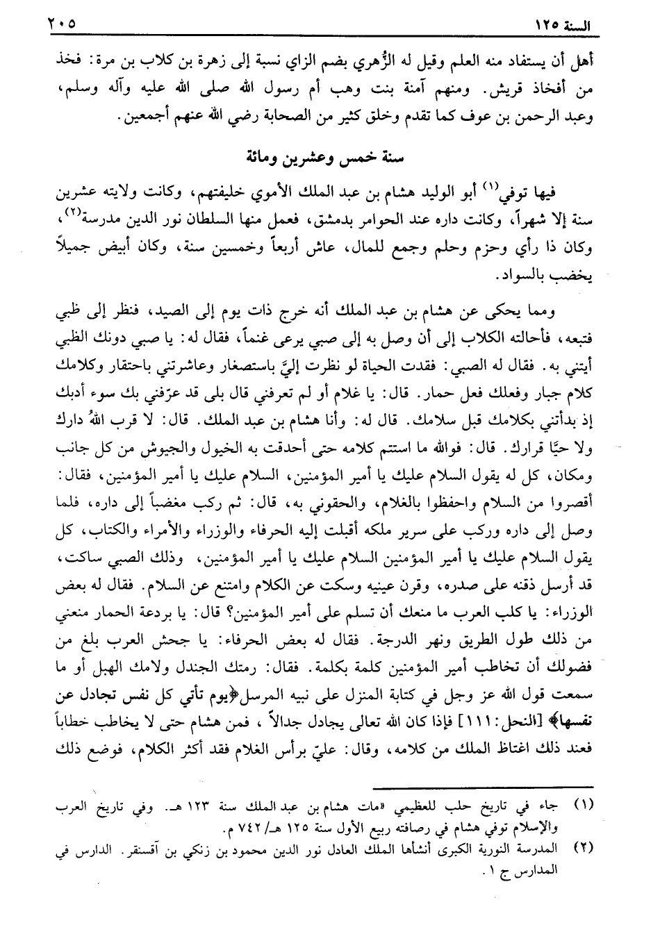 فيها توفي أبو الوليد هشام بن عبد الملك الأموي خليفتهم، وكانت ولايته عشرين سنة إلا شهراً، وكانت داره عند الحوامر بدمشق، فعمل منها السلطان نور الدين مدرسة، وكان ذا رأي وحزم وحلم وجمع للمال، عاش أربعاً وخمسين سنة، وكان أبيض جميلاً يخضب بالسواد. ومما يحكى عن هشام بن عبد الملك أنه خرج ذات يوم إلى الصيد، فنظر إلى ظبي فتبعه، فأحالته الكلاب إلى أن وصل به إلى صبي يرعى غنماً، فقال له: يا صبي دونك الظبي أيتني به. فقال له الصبي: فقدت الحياة لو نظرت إلي باستصغار وعاشرتني باحتقار وكلامك كلام جبار وفعلك فعل حمار. قال: يا غلام أو لم تعرفني قال بلى قد عرفني بك سوء أدبك إذ بدأتني بكلامك قبل سلامك. قال له: وأنا هشام بن عبد الملك. قال: لا قرب الله دارك ولا حيا قرارك. قال: فوألله ما استتم كلامه حتى أحدقت به الخيول والجيوش من كل جانب ومكان، كل له يقول السلام عليك يا أمير المؤمنين، السلام عليك يا أمير المؤمنين، فقال: اقصروا من السلام واحفظوا بالغلام، والحقوني به، قال: ثم ركب مغضباً إلى داره، فلما وصل إلى داره وركب على سرير ملكه أقبلت إليه الحرفاء والوزراء والأمراء والكتاب، كل يقول السلام عليك يا أمير المؤمنين السلام عليك يا أمير المؤمنين، وذلك الصبي ساكت، قد أرسل ذقنه على صدره، وقرن عينيه وسكت عن الكلام وامتنع عن السلام. فقال له بعض الوزراء: يا كلب العرب ما منعك أن تسلم على أمير المؤمنين؟ قال: يا بردعة الحمار منعني من ذلك طول الطريق ونهر الدرجة. فقال له بعض الحرفاء: يا جحش العرب بلغ من فضولك أن تخاطب أمير المؤمنين كلمة بكلمة. فقال: رمتك الجندل ولامك الهبل أو ما سمعت قول الله عز وجل في كتابة المنزل على نبيه المرسل " يوم تأتي كل نفس تجادل عن نفسها " - النحل: 111 - فإذا كان الله تعالى يجادل جدالاً، فمن هشام حتى لا يخاطب خطاباً فعند ذلك اغتاظ الملك من كلامه، وقال: علي برأس الغلام فقد أكثر الكلام، فوضع ذلك