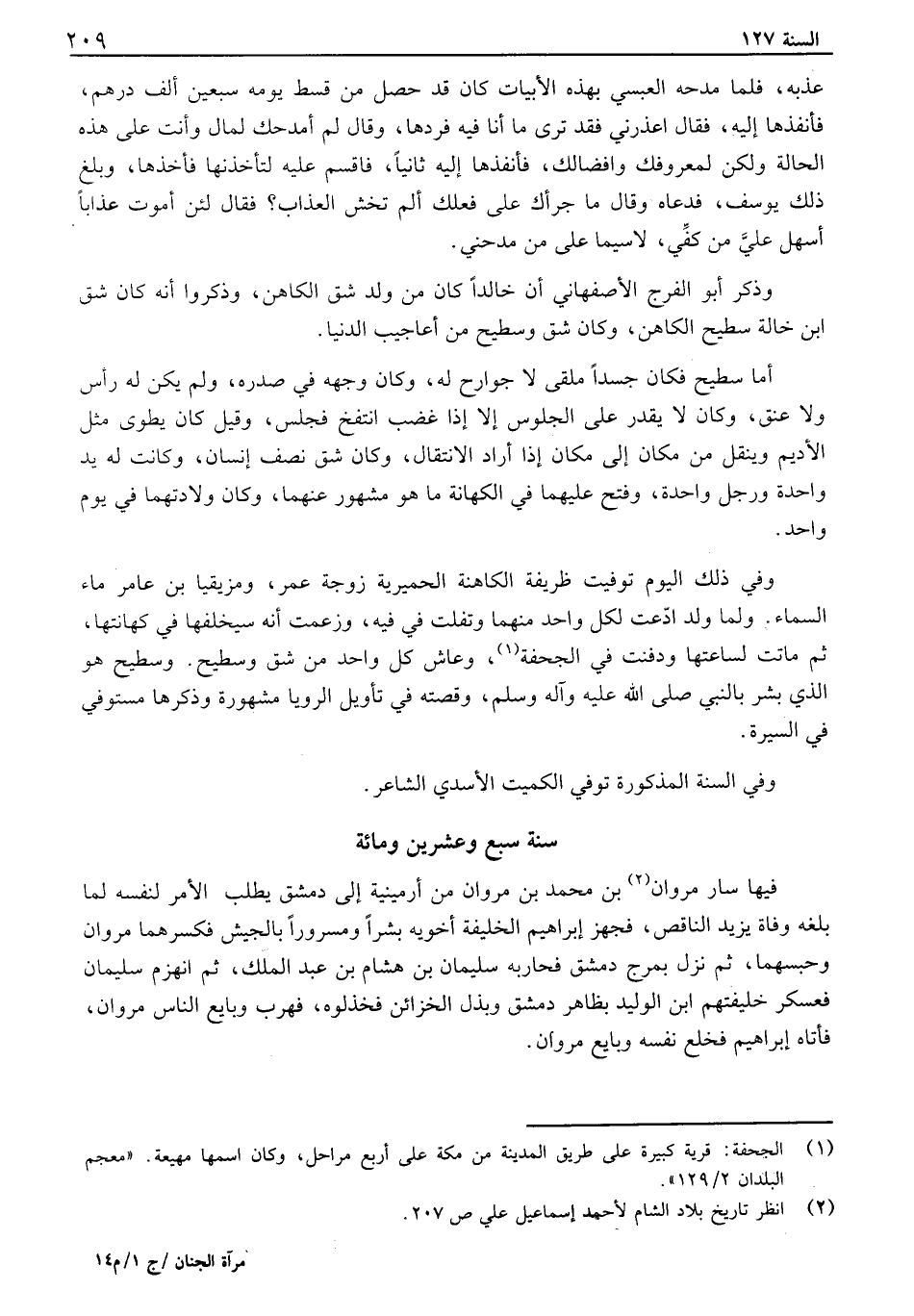 عذبه، فلما مدحه العبسي بهده الأبيات كان قد حصل من قسط يومه سبعين ألف درهم، فأنفذها إليه، فقال اعذرني فقد ترى ما أنا فيه فردها، وقال لم أمدحك لمال وأنت على هذه الحالة ولكن لمعروفك وافضالك، فأنفذها إليه ثانياً، فاقسم عليه لتأخذنها فأخذها، وبلغ ذلك يوسف، فدعاه وقال ما جرأك على فعلك ألم تخش العذاب؟ فقال لئن أموت عذاباً أسهل علي من كفي، لاسيما على من مدحني. وذكر أبو الفرج الأصفهاني أن خالداً كان من ولد شق الكاهن، وذكروا أنه كان شق ابن خالة سطيح الكاهن، وكان شق وسطيح من أعاجيب الدنيا. أما سطيح فكان جسداً ملقى لا جوارح له، وكان وجهه في صدره، ولم يكن له رأس ولا عنق، وكان لا يقدر على الجلوس إلا إذا غضب انتفخ فجلس، وقيل كان يطوى مثل الأديم وينقل من مكان إلى مكان إذا أراد الانتقال، وكان شق نصف إنسان، وكانت له يد واحدة ورجل واحدة، وفتح عليهما في الكهانة ما هو مشهور عنهما، وكان ولادتهما في يوم واحد. وفي ذلك اليوم توفيت ظريفة الكاهنة الحميرية زوجة عمر، ومزيقيا بن عامر ماء السماء. ولما ولد ادعت لكل واحد منهما وتفلت في فيه، وزعمت أنه سيخلفها في كهانتها، ثم ماتت لساعتها ودفتت في الجحفة، وعاش كل واحد من شق وسطيح. وسطيح هو الذي بشر بالنبي صلى الله عليه وآله وسلم، وقصته في تأويل الرويا مشهورة وذكرها مستوفي في السيرة. وفي السنة المذكورة توفي الكميت الأسدي الشاعر.