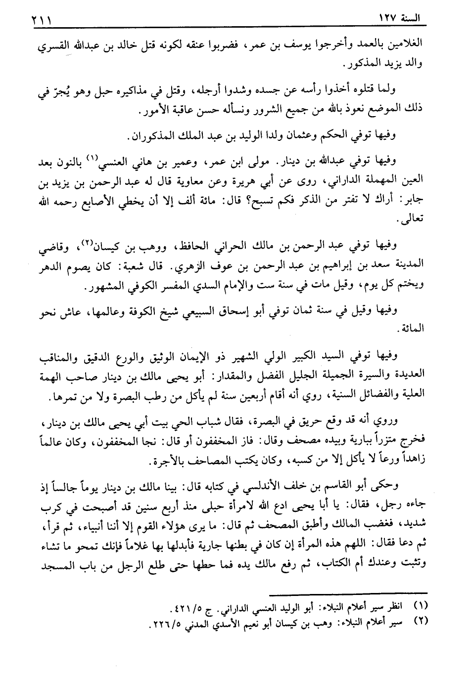 الغلامين بالعمد وأخرجوا يوسف بن عمر، فضربوا عنقه لكونه قتل خالد بن عبد الله القسري والد يزيد المذكور. ولما قتلوه أخذوا رأسه عن جسده وشدوا أرجله، وقتل في مذاكيره حبل وهو يجر في ذلك الموضع نعوذ بالله من جميع الشرور ونسأله حسن عاقبة الأمور. وفيها توفي الحكم وعثمان ولدا الوليد بن عبد الملك المذكوران. وفيها توفي عبد الله بن دينار. مولى ابن عمر، وعمير بن هاني العنسي بالنون بعد العين المهملة الداراني، روى عن أبي هريرة وعن معاوية قال له عبد الرحمن بن يزيد بن جابر: اراك لا تفتر من الذكر فكم تسبح؟ قال: مائة ألف إلا أن يخطي الأصابع رحمه الله تعالى. وفيها توفي عبد الرحمن بن مالك الحراني الحافظ، ووهب بن كيسان، وقاضي المدينة سعد بن إبراهيم بن عبد الرحمن بن عوف الزهري. قال شعبة: كان يصوم الدهر ويختم كل يوم، وقيل مات في سنة ست والإمام السدي المفسر الكوفي المشهور. وفيها وقيل في سنة ثمان توفي أبو إسحاق السبيعي شيخ الكوفة وعالمها، عاش نحو المائة. وفيها توفي السيد الكبير الولي الشهير ذو الإيمان الوثيق والورع الدقيق والمناقب العديدة والسيرة الجميلة الجليل الفضل والمقدار: ابو يحيى مالك بن دينار صاحب الهمة العلية والفضائل السنية، روي أنه أقام أربعين سنة لم يأكل من رطب البصرة ولا من تمرها. وروي أنه قد وقع حريق في البصرة، فقال شباب الحي بيت أبي يحيى مالك بن دينار، فخرج متزراً ببارية وبيده مصحف وقال: فاز المخففون أو قال: نجا المخففون، وكان عالماً زاهداً ورعاً لا يأكل إلا من كسبه، وكان يكتب المصاحف بالأجرة. وحكى أبو القاسم بن خلف الأندلسي في كتابه قال: بينا مالك بن دينار يوماً جالساً إذ جاءه رجل، فقال: يا أبا يحيى ادع الله لامرأة حبلى منذ أربع سنين قد أصبحت في كرب شديد، فغضب المالك وأطبق المصحف ثم قال: ما يرى هؤلاء القوم إلا أننا أنبياء، ثم قرأ ثم دعا فقال: اللهم هذه المرأة إن كان في بطنها جارية فأبدلها بها غلاماً فإنك تمحو ما يشاء وتثبت وعندك أم الكتاب، ثم رفع مالك يده فما حطها حتى طلع الرجل من باب المسجد
