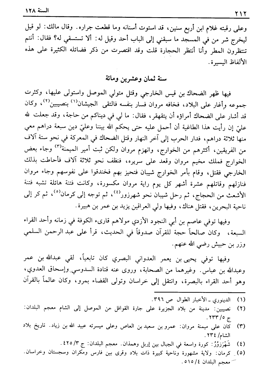 وفيها توفي عاصم بن أبي النجود الأزدي مولاهم قارىء الكوفة في زمانه وأحد القراء السبعة، وكان صالحاً حجة للقرآن صدوقاً في الحديث، قرأ على عبد الرحمن السلمي وزر بن حبيش رضي " الله عنهم. وفيها توفي يحيى بن يعمر العدواني البصري كان تابعياً، لقي عبد الله بن عمر وعبد الله بن عباس. وغيرهما من الصحابة، وروى عنه قتادة السدوسي وإسحاق العدوي، وهو أحد القراء بالبصرة، وانتقل إلى خراسان وتولى القضاء بمرو، وكان عالماً بالقرآن