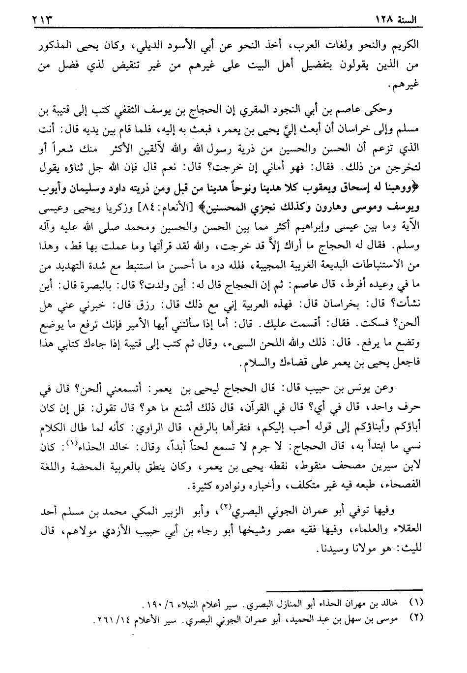 الكريم والنحو ولغات العرب، اخذ النحو عن أبي الاسود الديلي، وكان يحيى المذكور من الذين يقولون بتفضيل أهل البيت على غيرهم من غير تنقيض لذي فضل من غيرهم. وحكى عاصم بن أبي النجود المقري إن الحجاج بن يوسف الثقفي كتب إلى قتيبة بن مسلم وإلى خراسان أن أبعث إلي يحيى بن يعمر، فبعث به إليه، فلما قام بين يديه قال: انت الذي تزعم أن الحسن والحسين من ذرية رسول الله والله لآلقين الأكثر منك شعراً أو لتخرجن من ذلك. فقال: فهو أماني إن خرجت؟ قال: نعم قال فإن الله جل ثناؤه يقول " ووهبنا له إسحاق ويعقوب كلا هدينا ونوحاً هدينا من قبل ومن ذريته داود وسليمان وأيوب ويوسف وموسى وهارون وكذلك نجزي المحسنين " - الأنعام: 84 - وزكريا ويحيى وعيسى الآية وما بين عيسى وإبراهيم أكثر مما بين الحسن والحسين ومحمد صلى الله عليه وآله وسلم. فقال له الحجاج ما أراك إلا قد خرجت، والله لقد قرأتها وما عملت بها قط، وهذا من الاستنباطات البديعة الغريبة المجيبة، فلله دره ما أحسن ما استنبط مع شدة التهديد من ما في وعيده أفرط، قال عاصم: ثم إن الحجاج قال له: اين ولدت؟ قال: بالبصرة قال: ايزننشأت؟ قال: بخراسان قال: فهذه العربية إني مع ذلك قال: رزق قال: خبرني عني هل ألحن؟ فسكت. فقال: اقسمت عليك. قال: اما إذا سألتني أيها الأمير فإنك ترفع ما يوضع وتضع ما يرفع. قال: ذلك والله اللحن السيىء، وقال ثم كتب إلى قتيبة إذا جاءك كتابي هذا فاجعل يحيى بن يعمرعلى قضاءك والسلام. وعن يونس بن حبيب قال: قال الحجاج ليحيى بن يعمر: اتسمعني ألحن؟ قال في حرف واحد، قال في أي؟ قال في القرآن، قال ذلك أشنع ما هو؟ قال تقول: قل إن كان أباؤكم وأبناؤكم إلى قوله أحب إليكم، فتقرأها بالرفع، قال الراوي: كأنه لما طال الكلام نسي ما ابتدأ به، قال الحجاج: لا جرم لا تسمع لحناً أبداً، وقال: خالد الحذاء: كان لابن سيرين مصحف منقوط، نقطه يحيى بن يعمر، وكان ينطق بالعربية المحضة واللغة الفصحاء، طبعه فيه غير متكلف، وأخباره ونوادره كثيرة. وفيها توفي أبو عمران الجوني البصري، وأبو الزبير المكي محمد بن مسلم أحد العقلاء والعلماء، وفيها فقيه مصر وشيخها أبو رجاء بن أبي حبيب الأزدي مولاهم، قال لليث: هو مولانا وسيدنا.