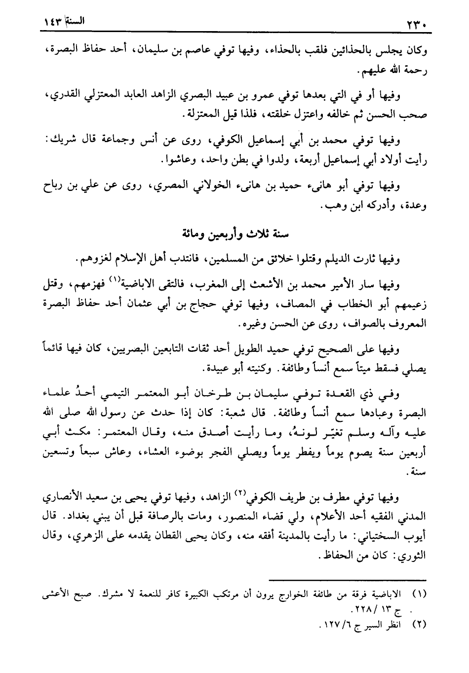 وفيها ثارت الديلم وقتلوا خلائق من المسلمين، فانتدب أهل الإسلام لغزوهم. وفيها سار الأمير محمد بن الأشعث إلى المغرب، فالتقى الاباضية فهزمهم، وقتل زعيمهم أبو الخطاب في المصاف، وفيها توفي حجاج بن أبي عثمان أحد حفاظ البصرة المعروف بالصواف، روى عن الحسن وغيره. وفيها على الصحيح توفي حميد الطويل أحد ثقات التابعين البصريين، كان فيها قائماً يصلي فسقط ميتاً سمع أنساً وطائفة. وكنيته أبو عبيدة. وفي ذي القعدة توفي سليمان بن طرخان أبو المعتمر التيمي أحد علماء البصرة وعبادها سمع أنساً وطائفة. قال شعبة: كان إذا حدث عن رسول الله صلى الله عليه وآله وسلم تغير لونه، وما رأيت أصدق منه، وقال المعتمر: مكث أبي أربعين سنة يصوم يوماً ويفطر يوماً ويصلي الفجر بوضوء العشاء، وعاش سبعاً وتسعين سنة. وفيها توفي مطرف بن طريف الكوفي الزاهد، وفيها توفي يحيى بن سعيد الأنصاري المدني الفقيه أحد الأعلام، ولي قضاء المنصور، ومات بالرصافة قبل أن يبني بغداد. قال ايوب السختياني: ما رأيت بالمدينة أفقه منه، وكان يحيى القطان يقدمه على الزهري، وقال الثوري: كان من الحفاظ.