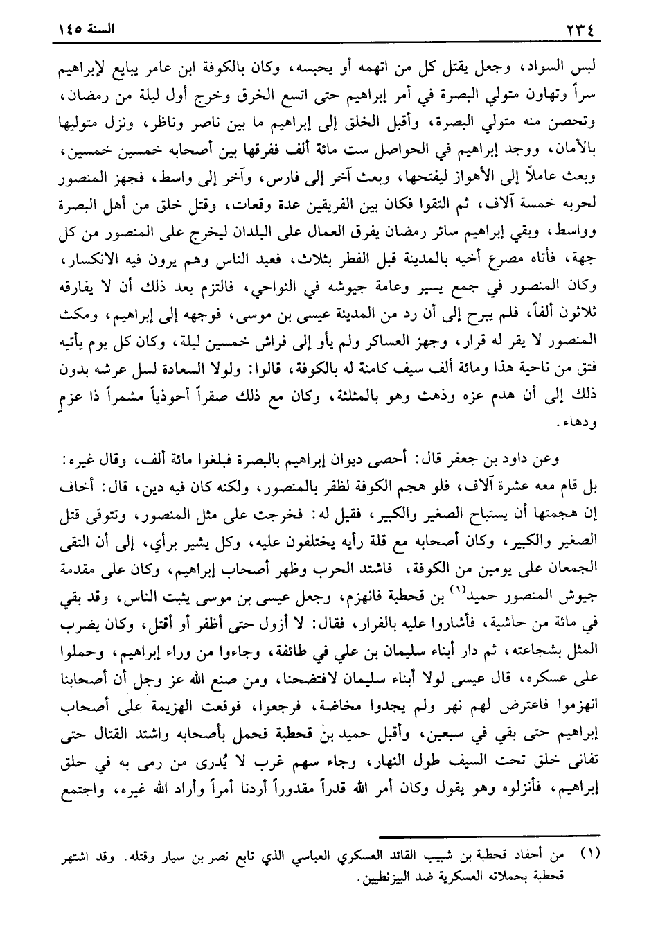 لبس السواد، وجعل يقتل كل من اتهمه أو يحبسه، وكان بالكوفة ابن عامر يبايع لإبراهيم سراً وتهاون متولي البصرة في أمر إبراهيم حتى اتسع الخرق وخرج أول ليلة من رمضان، وتحصن منه متولي البصرة، وأقبل الخلق إلى إبراهيم ما بين ناصر وناظر، ونزل متوليها بالأمان، ووجد إبراهيم في الحواصل ست مائة ألف ففرقها بين أصحابه خمسين خمسين، وبعث عاملاً إلى الأهواز ليفتحها، وبعث آخر إلى فارس، وآخر إلى واسط، فجهز المنصور لحربه خمسة آلاف، ثم التقوا فكان بين الفريقين عدة وقعات، وقتل خلق من أهل البصرة وواسط، وبقي إبراهيم سائر رمضان يفرق العمال على البلدان ليخرج على المنصور من كل جهة، فأتاه مصرع أخيه بالمدينة قبل الفطر بثلاث، فعيد الناس وهم يرون فيه الانكسار، وكان المنصور في جمع يسير وعامة جيوشه في النواحي، فالتزم بعد ذلك أن لا يفارقه ثلاثون ألفاً، فلم يبرح إلى أن رد من المدينة عيسى بن موسى، فوجهه إلى إبراهيم، ومكث المنصور لا يقر له قرار، وجهز العساكر ولم يأو إلى فراش خمسين ليلة، وكان كل يوم يأتيه فتق من ناحية هذا ومائة ألف سيف كامنة له بالكوفة، قالوا: ولولا السعادة لسل عرشه بدون ذلك إلى أن هدم عزه وذهث وهو بالمثلثة، وكان مع ذلك صقراً أحوذياً مشمراً ذا عزم ودهاء.