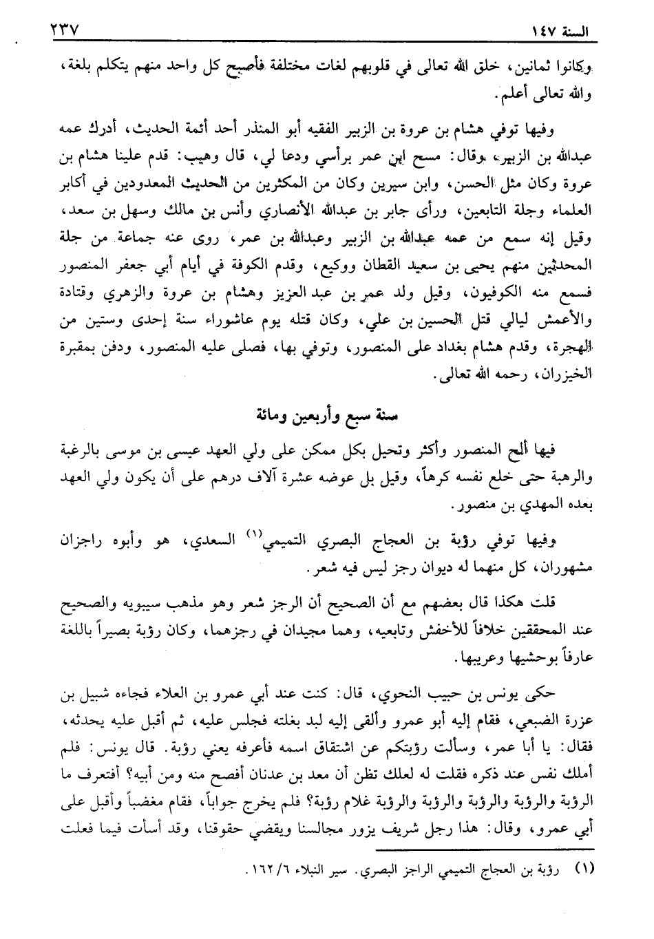 فيها ألح المنصور وأكثر وتحيل بكل ممكن على ولي العهد عيسى بن موسى بالرغبة والرهبة حتى خلع نفسه كرهاً، وقيل بل عوضه عشرة آلاف درهم على أن يكون ولي العهد بعده المهدي بن منصور. وفيها توفي رؤبة بن العجاج البصري التميمي السعدي، هو وأبوه راجزان مشهوران، كل منهما له ديوان رجز ليس فيه شعر. قلت هكذا قال بعضهم مع أن الصحيح أن الرجز شعر وهو مذهب سيبويه والصحيح عند المحققين خلافاً للأخفش وتابعيه، وهما مجيدان في رجزهما، وكان رؤبة بصيراً باللغة عارفاً بوحشيها وعريبها. حكى يونس بن حبيب النحوي، قال: كنت عند أبي عمرو بن العلاء فجاءه شبيل بن عزرة الضبعي، فقام إليه أبو عمرو وألقى إليه لبد بغلته فجلس عليه، ثم أقبل عليه يحدثه، فقال: يا أبا عمر، وسألت رؤبتكم عن اشتقاق اسمه فأعرفه يعني رؤبة. قال يونس: فلم أملك نفس عند ذكره فقلت له لعلك تظن أن معد بن عدنان أفصح منه ومن أبيه؟ افتعرف ما الرؤبة والرؤبة والرؤية والرؤبة والرؤبة غلام رؤبة؟ فلم يخرج جواباً، فقام مغضباً وأقبل على أبي عمرو، وقال: هذا رجل شريف يزور مجالسنا ويقضي حقوقنا، وقد أسأت فما فعلت