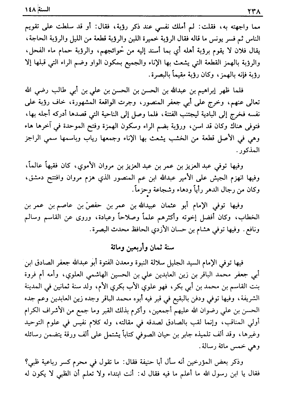 فيها توفي الإمام السيد الجليل سلالة النبوة ومعدن الفتوة أبوعبد الله جعفر الصادق ابن أبي جعفر محمد الباقر بن زين العابدين علي بن الحسين الهاشمي العلوي، وأمه أم فروة بنت القاسم بن محمد بن أبي بكر، فهو علوي الأب بكري الأم، ولد سنة ثمانين في المدينة الشريفة، وفيها توفي ودفن بالبقيع في قبر فيه أبوه محمد الباقر وجده زين العابدين وعم جده الحسن بن علي رضوان الله عليهم أجمعين، وأكرم بذلك القبر وما جمع من الأشراف الكرام أولي المناقب، وإنما لقب بالصادق لصدقه في مقالته، وله كلام نفيس في علوم التوحيد وغيرها، وقد ألف تلميذه جابر بن حيان الصوفي كتاباً يشتمل على ألف ورقة يتضمن رسائله وهي خمس مائة رسالة. وذكر بعض المؤرخين أنه سأل أبا حنيفة فقال: ما تقول في محرم كسر رباعية ظبي؟ فقال يا ابن رسول الله ما أعلم ما فيه فقال له: انت ابتداء ولا تعلم أن الظبي لا يكون له