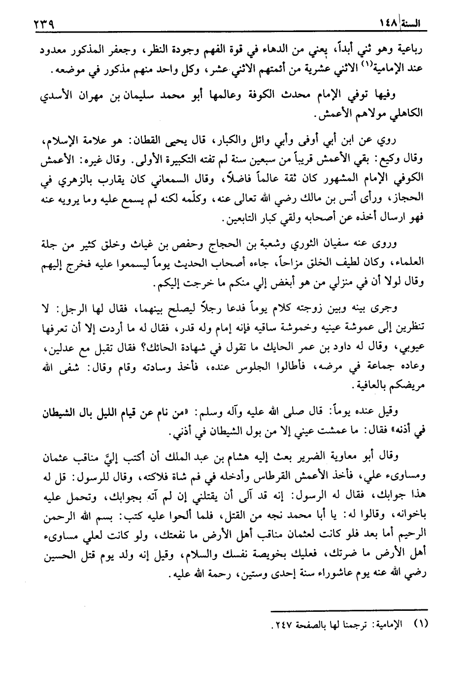 رباعية وهو ثني أبداً، يعني من الدهاء في قوة الفهم وجوعة النظر، وجعفر المذكور معدود عند الإمامية الاثني عشرية من أئمتهم الاثني عشر، وكل واحد منهم مذكور في موضعه. وفيها توفي الإمام محدث الكوفة وعالمها أبو محمد سليمان بن مهران الأسدي الكاهلي مولاهم الأعمش. روي عن ابن ابي أوفى وأبي وائل والكبار، قال يحيى القطان: هو علامة الإسلام، وقال وكيع: بقي الأعمش قريباً من سبعين سنة لم تفته التكبيرة الأولى. وقال غيره: الأعمش الكوفي الإمام المشهور كان ثقة عالماً فاضلاً، وقال السمعاني كان يقارب بالزهري في الحجاز، ورأى أنس بن مالك رضي الله تعالى عنه، وكلمه لكنه لم يسمع عليه وما يرويه عنه فهو ارسال أخذه عن أصحابه ولقي كبار التابعين. وروى عنه سفيان الثوري وشعبة بن الحجاج وحفص بن غياث وخلق كثير من جلة العلماء، وكان لطيف الخلق مزاحاً، جاءه أصحاب الحديث يوماً ليسمعوا عليه فخرج إليهم وقال لولا أن في منزلي من هو أبغض إلي منكم ما خرجت إليكم. وجرى بينه وبين زوجته كلام يوماً فدعا رجلاً ليصلح بينهما، فقال لها الرجل: لا تنظرين إلى عموشة عينيه وخموشة ساقيه فإنه إمام وله قدر، فقال له ما أردت إلا أن تعرفها عيوبي، وقال له داود بن عمر الحايك ما تقول في شهادة الحائك؟ فقال تقبل مع عدلين، وعاده جماعة في مرضه، فأطالوا الجلوس عنده، فأخذ وسادته وقام وقال: شفى الله مريضكم بالعافية.