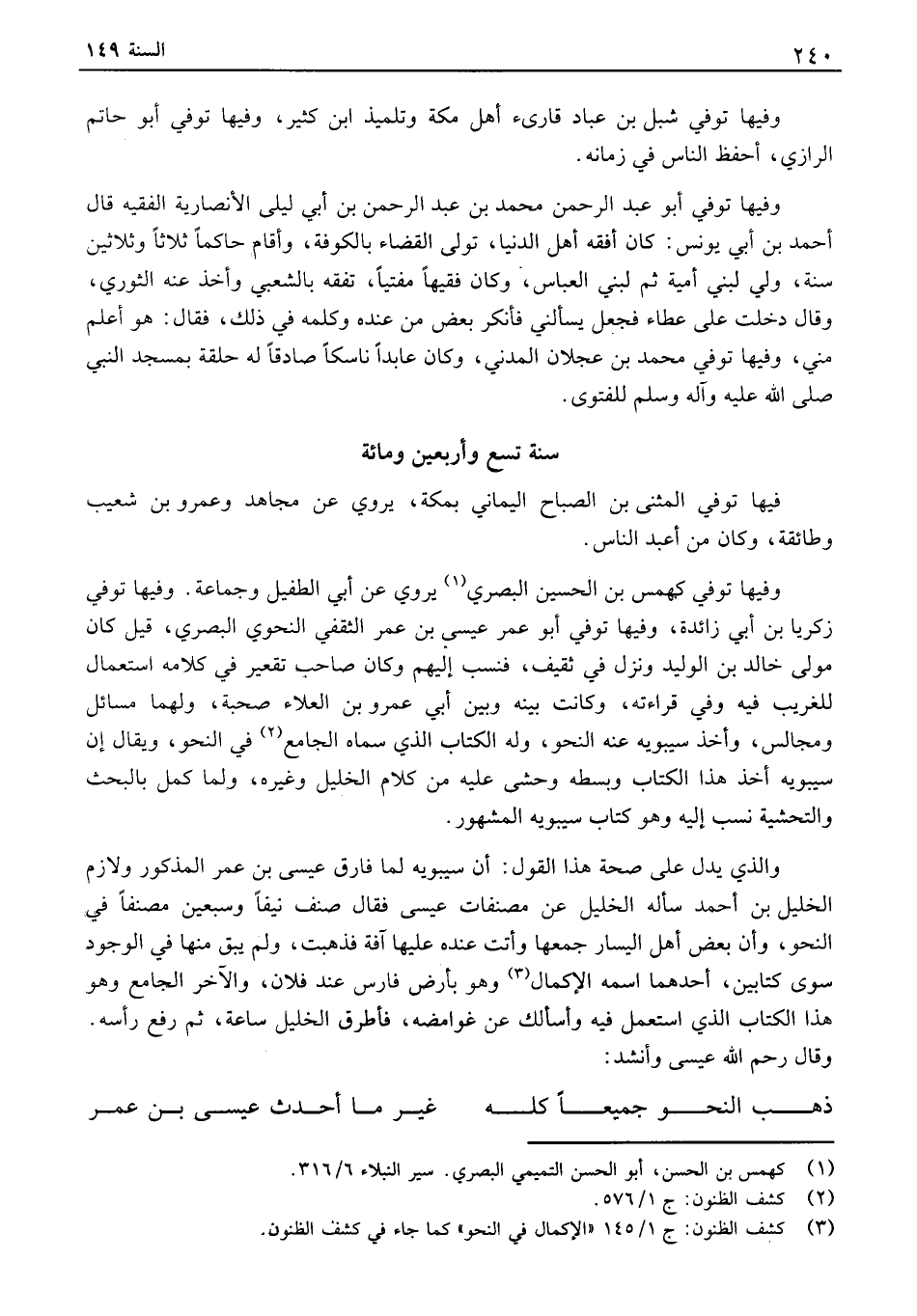 ؟ سنة تسع وأربعين ومائة فيها توفي المثنى بن الصباح اليماني بمكة، يروي عن مجاهد وعمرو بن شعيب وطائقة، وكان من أعبد الناس. وفيها توفي كهمس بن الحسين البصري يروي عن أبي الطفيل وجماعة. وفيها توفي زكريا بن أبي زائدة، وفيها توفي أبو عمر عيسى بن عمر الثقفي النحوي البصري، قيل كان مولى خالد بن الوليد ونزل في ثقيف، فنسب إليهم وكان صاحب تقعير في كلامه استعمال للغريب فيه وفي قراءته، وكانت بينه وبين أبي عمرو بن العلاء صحبة، ولهما مسائل ومجالس، وأخذ سيبويه عنه النحو، وله الكتاب الذي سماه الجامع في النحو، ويقال إن سيبويه أخذ هذا الكتاب وبسطه وحشى عليه من كلام الخليل وغيره، ولما كمل بالبحث والتحشية نسب إليه وهو كتاب سيبويه المشهور. والذي يدل على صحة هذا القول: ان سيبويه لما فارق عيسى بن عمر المذكور ولازم الخليل بن أحمد سأله الخليل عن مصنفات عيسى فقال صنف نيفاً وسبعين مصنفاً في النحو، وأن بعض أهل اليسار جمعها وأتت عنده عليها آفة فذهبت، ولم يبق منها في الوجود سوى كتابين، احدهما اسمه الإكمال وهو بأرض فارس عند فلان، والآخر الجامع وهو هذا الكتاب الذي استعمل فيه وأسألك عن غوامضه، فأطرق الخليل ساعة، ثم رفع رأسه. وقال رحم الله عيسى وأنشد: