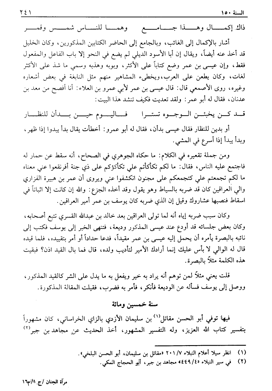 فيها توفي أبو الحسن مقاتل بن سليمان الأزدي بالزاي الخراساني، كان مشهوراً بتفسير كتاب الله العزيز، وله التفسير المشهور، اخذ الحديث عن مجاهد بن جبر