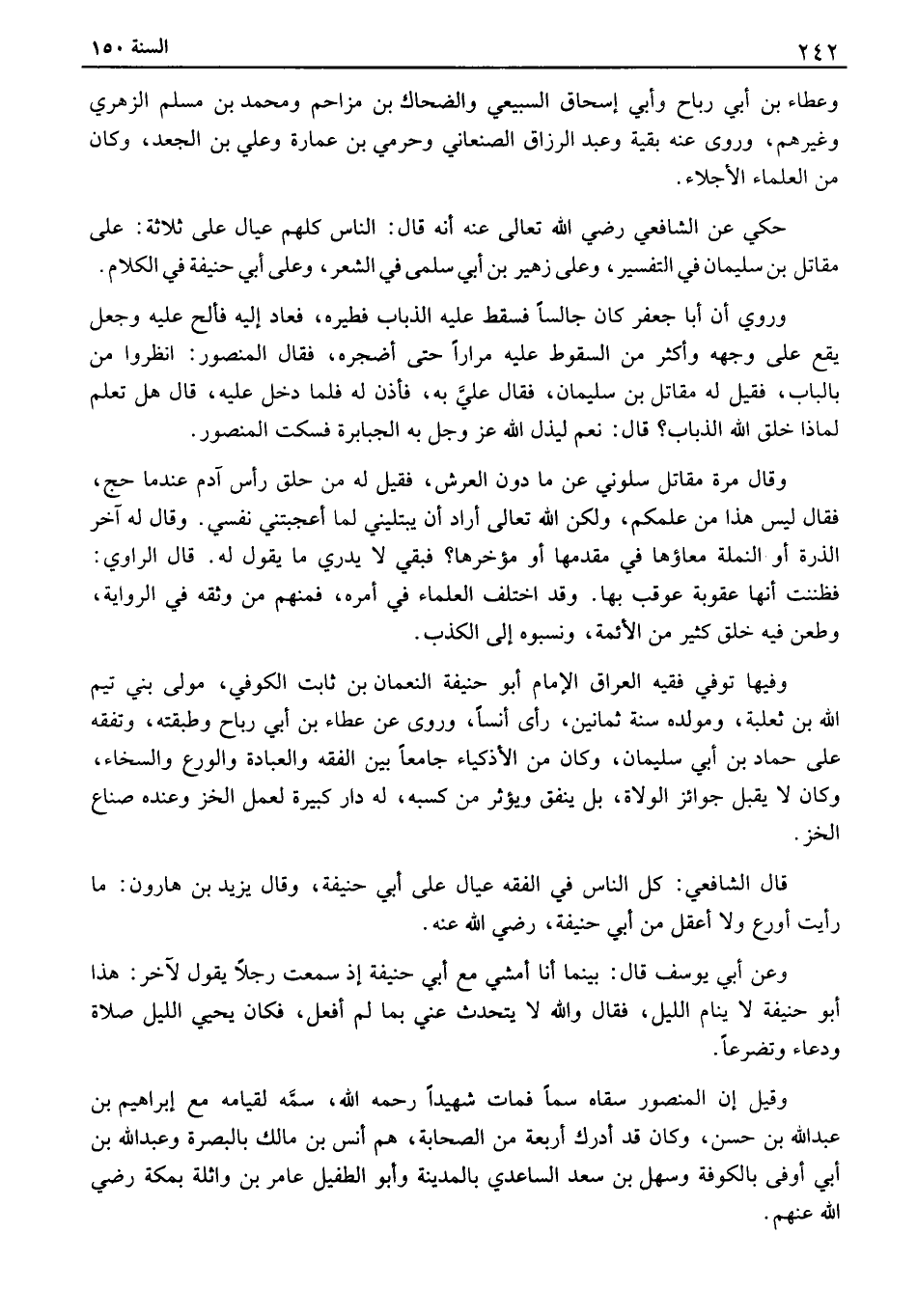 وعطاء بن أبي رباح وأبي إسحاق السبيعي والضحاك بن مزاحم ومحمد بن مسلم الزهري وغيرهم، وروى عنه بقية وعبد الرزاق الصنعاني وحرمي بن عصارة وعلي بن الجعد، وكان من العلماء الأجلاء. حكي عن الشافعي رضي الله تعالى عنه أنه قال: الناس كلهم عيال على ثلاثة: على مقاتل بن سليمان في التفسير، وعلى زهير بن أبي سلمى في الشعر، وعلى أبي حنيفة في الكلام. وروي أن أبا جعفر كان جالساً فسقط عليه الذباب فطيره، فعاد إليه فألح عليه وجعل يقع على وجهه وأكثر من السقوط عليه مراراً حتى أضجره، فقال المنصور: انظروا من بالباب، فقيل له مقاتل بن سليمان، فقال علي به، فأذن له فلما دخل عليه، قال هل تعلم لماذا خلق الله الذباب؟ قال: نعم ليذل الله عز وجل به الجبابرة فسكت المنصور. وقال مرة مقاتل سلوني عن ما دون العرش، فقيل له من حلق رأس آدم عندما حج، فقال ليس هذا من علمكم، ولكن الله تعالى أراد أن يبتليني لما أعجبتني نفسي. وقال له آخر الذرة أو النملة معاؤها في مقدمها أو مؤخرها؟ فبقي لا يدري ما يقول له. قال الراوي: فظننت أنها عقوبة عوقب بها. وقد اختلف العلماء في أمره، فمنهم من وثقه في الرواية، وطعن فيه خلق كثير من الأئمة، ونسبوه إلى الكذب. وفيها توفي فقيه العراق الإمام أبو حنيفة النعمان بن ثابت الكوفي، مولى بني تيم الله بن ثعلبة، ومولده سنة ثمانين، رأى أنساً، وروى عن عطاء بن أبي رباح وطبقته، وتفقه على حماد بن أبي سليمان، وكان من الأذكياء جامعاً بين الفقه والعبادة والورع والسخاء، وكان لا يقبل جوائز الولاة، بل ينفق ويؤثر من كسبه، له دار كبيرة لعمل الخز وعنده صناع الخز. قال الثمافعي: كل الناس في الفقه عيال على أبي حنيفة، وقال يزيد بن هارون: ما رأيت أورع ولا أعقل من أبي حنيفة، رضي الله عنه. وعن أبي يوسف قال: بينما أنا أمشي مع أبي حنيفة إذ سمعت رجلاً يقول لآخر: هذا أبو حنيفة لا ينام الليل، فقال والله لا يتحدث عني بما لم أفعل، فكان يحيي الليل صلاة ودعاء وتضرعاً. وقيل إن المنصور سقاه سما فمات شهيداً رحمه الله، سمه لقيامه مع إبراهيم بن عبد الله بن حسن، وكان قد أدرك أربعة من الصحابة، هم أنس بن مالك بالبصرة وعبد الله بن أبي أوفى بالكوفة وسهل بن سعد الساعدي بالمدينة وأبو الطفيل عامر بن واثلة بمكه رضي الله عنهم.