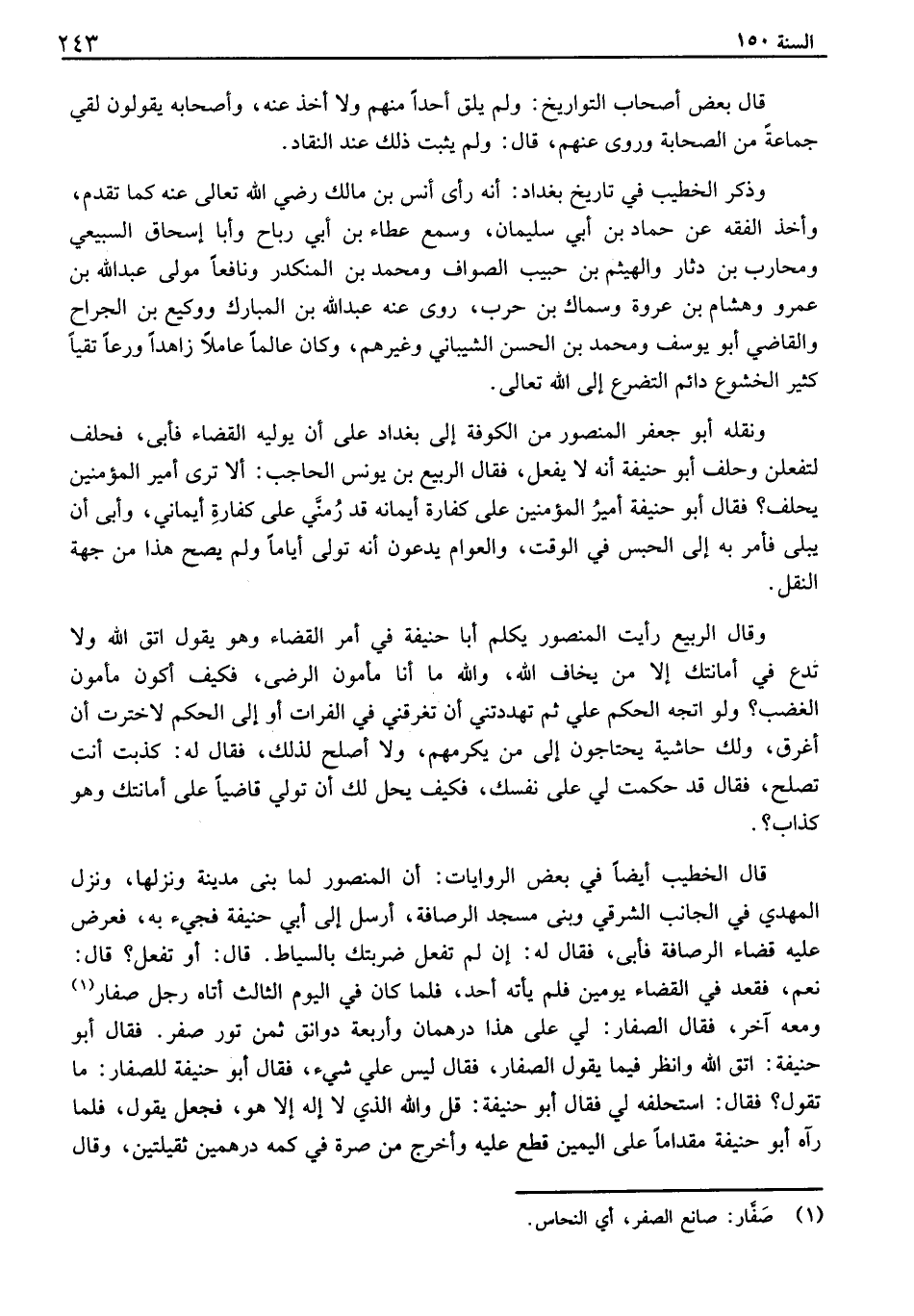 في اليوم الثالث أتاه رجل صفار ومعه آخر، فقال الصفار: لي على هذا درهمان وأربعة دوانق ثمن تور صفر. فقال أبو حنيفة: اتق الله وانظر فيما يقول الصفار، فقال ليس علي شيء، فقال أبو حنيفة للصفار: ما تقول؟ فقال: استحلفه لي فقال أبو حنيفة: قل والله الذي لا إله إلا هو، فجعل يقول، فلما رآه أبو حنيفة مقداماً على اليمين قطع عليه وأخرج من صرة في كمه درهمين ثقيلتين، وقال للصفار خذ هذا عوض ما لك عليه، فلما كان بعد يومين اشتكى أبو حنيفة فمرض ستة أيام ثم مات. وكان يزيد بن عمر بن هبيرة الفزاري أمير العراقين أرده للقضاء بالكوفة أيام مروان بن محمد آخر ملوك بني أمية، فأبى عليه، وضربه مائة سوط وعشرة سواط، كل يوم عشرة أسواط. وهو على الامتناع، فلما رأى ذلك خلى سبيله، وكان الإمام أحمد بن حنبل إذا ذكر ذلك بكى وترحم على أبي حنيفة، وذلك بعد إن ضرب الإمام أحمد على ترك القول بخلق القرآن، يعني البكاء والترحم. وذكر الخطيب في تاريخه أيضاً أن أبا حنيفة رضي الله عنه رأى في المنام أنه ينبش قبر رسول الله صلى الله عليه وآله وسلم. فبعث من سأل محمد بن سيرين، فقال ابن سيرين: صاحب هذه الرؤيا يثور علماً لم يسبقه إليه أحد. وقال الإمام الشافعي رضي الله عنه قيل لمالك هل رأيت أبا حنيفة؟ قال نعم رأيت رجلاً لو كلمك في هذه السارية أن يجعلها ذهباً لقام بحجته وروى حرملة ين يحيى عن الشافعي، قال: الناس عيال على هؤلاء الخمسة من أراد أن يتبحر في الفقه فهو عيال على أبي حنيفة، ومن أراد أن يتبحر في التفسير فهو عيال على مقاتل ين سليمان، ومن أراد أن يتبحر في النحو فهو عيال على الكسائي ومن أراد أن يتبحر في الشعر فهو عيال على زهير بن أبي سلمى، ومن أراد أن يتبحر في المغازي فهو عيال على بن محمد بن إسحاق. وفيها توفي وقيل في التي قبلها وقل في التي بعدها أبو الوليد عبد الملك بن عبد العزيز بن جريح القرشي مولاهم المكي، كان أحد العلماء المشهورين، ويقال إنه أول من صنف الكتب في الإسلام، قال رحمه الله: كنت مع معن بن زائدة باليمن فحضر وقت الحج، فلم يخطر لي نية، فخطر ببالي قول عمرو بن ربيعة: اليوم الثالث أتاه رجل صفار ومعه آخر، فقال الصفار: لي على هذا درهمان وأربعة دوانق ثمن تور صفر. فقال أبو حنيفة: اتق الله وانظر فيما يقول الصفار، فقال ليس علي شيء، فقال أبو حنيفة للصفار: ما تقول؟ فقال: استحلفه لي فقال أبو حنيفة: قل والله الذي لا إله إلا هو، فجعل يقول، فلما رآه أبو حنيفة مقداماً على اليمين قطع عليه وأخرج من صرة في كمه درهمين ثقيلتين، وقال