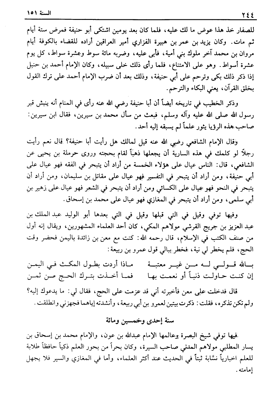 للصفار خذ هذا عوض ما لك عليه، فلما كان بعد يومين اشتكى أبو حنيفة فمرض ستة أيام ثم مات. وكان يزيد بن عمر بن هبيرة الفزاري أمير العراقين أرده للقضاء بالكوفة أيام مروان بن محمد آخر ملوك بني أمية، فأبى عليه، وضربه مائة سوط وعشرة سواط، كل يوم عشرة أسواط. وهو على الامتناع، فلما رأى ذلك خلى سبيله، وكان الإمام أحمد بن حنبل إذا ذكر ذلك بكى وترحم على أبي حنيفة، وذلك بعد إن ضرب الإمام أحمد على ترك القول بخلق القرآن، يعني البكاء والترحم. وذكر الخطيب في تاريخه أيضاً أن أبا حنيفة رضي الله عنه رأى في المنام أنه ينبش قبر رسول الله صلى الله عليه وآله وسلم. فبعث من سأل محمد بن سيرين، فقال ابن سيرين: صاحب هذه الرؤيا يثور علماً لم يسبقه إليه أحد. وقال الإمام الشافعي رضي الله عنه قيل لمالك هل رأيت أبا حنيفة؟ قال نعم رأيت رجلاً لو كلمك في هذه السارية أن يجعلها ذهباً لقام بحجته وروى حرملة ين يحيى عن الشافعي، قال: الناس عيال على هؤلاء الخمسة من أراد أن يتبحر في الفقه فهو عيال على أبي حنيفة، ومن أراد أن يتبحر في التفسير فهو عيال على مقاتل ين سليمان، ومن أراد أن يتبحر في النحو فهو عيال على الكسائي ومن أراد أن يتبحر في الشعر فهو عيال على زهير بن أبي سلمى، ومن أراد أن يتبحر في المغازي فهو عيال على بن محمد بن إسحاق. وفيها توفي وقيل في التي قبلها وقل في التي بعدها أبو الوليد عبد الملك بن عبد العزيز بن جريح القرشي مولاهم المكي، كان أحد العلماء المشهورين، ويقال إنه أول من صنف الكتب في الإسلام، قال رحمه الله: كنت مع معن بن زائدة باليمن فحضر وقت الحج، فلم يخطر لي نية، فخطر ببالي قول عمرو بن ربيعة: