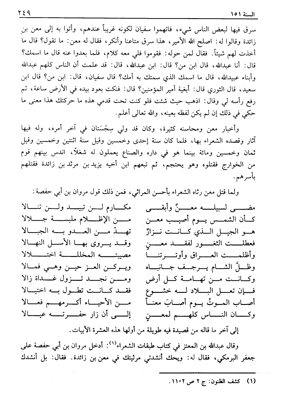 إلى آخر ما قاله من قصيدة فيه طويلة من أولها هذه العشرة الأبيات. وقال عبد الله بن المعتز في كتاب طبقات الشعراء: ادخل مروان بن أبي حفصة على جعفر البرمكي، فقال له: ويحك أنشدتي مرثيتك في معن بن زائدة. فقال: بل أنشدك