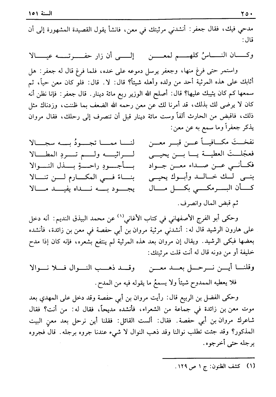 مدحي فيك، فقال جعفر: أنشدني مرثيتك في معن، فانشأ يقول القصيدة المشهورة الى أن قال: