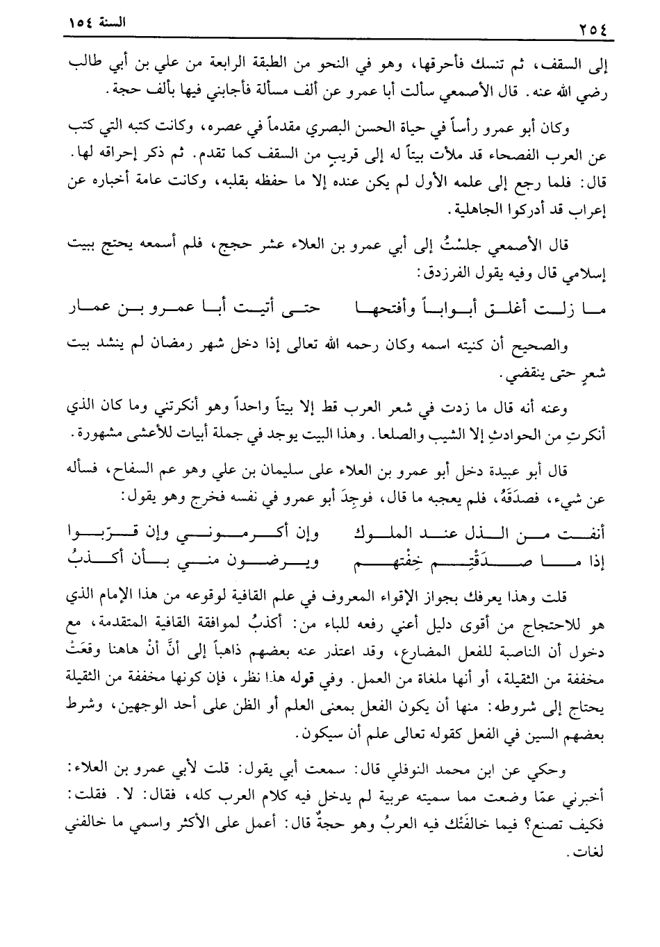 قال الأصمعي جلست إلى أبي عمرو بن العلاء عشر حجج، فلم أسمعه يحتج ببيت إسلامي قال وفيه يقول الفرزدق: