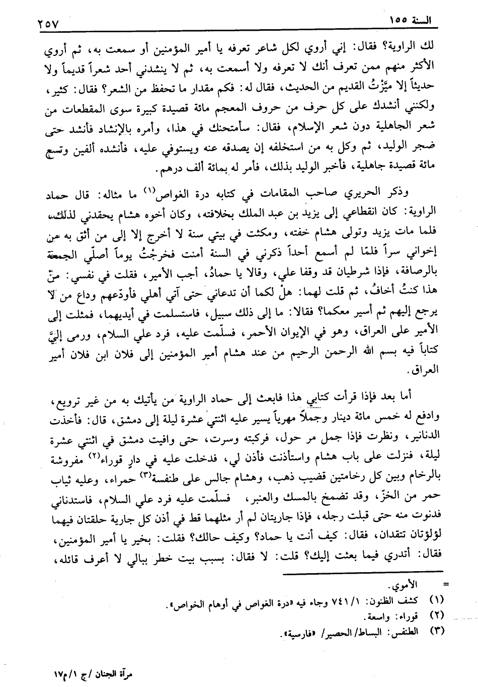لك الراوية؟ فقال: اني أروي لكل شاعر تعرفه يا أمير المؤمنين أو سمعت به، ثم أروي الأكثر منهم ممن تعرف أنك لا تعرفه ولا أسمعت به، ثم لا ينشدني أحد شعراً قديماً ولا حديثاً إلا ميزت القديم من الحديث، فقال له: فكم مقدار ما تحفظ من الشعر؟ فقال: كثير، ولكنني أنشدك على كل حرف من حروف المعجم مائة قصيدة كبيرة سوى المقطعات من شعر الجاهلية دون شعر الإسلام، فقال: سأمتحنك في هذا، وأمره بالإنشاد فأنشد حتى ضجر الوليد، ثم وكل به من استخلفه إن يصدقه عنه ويستوفي عليه، فأنشده ألفين وتسع مائة قصيدة جاهلية، فأخبر الوليد بذلك، فأمر له بمائة ألف درهم. وذكر الحريري صاحب المقامات في كتابه درة الغواص ما مثاله: قال حماد الراوية: كان انقطاعي إلى يزيد بن عبد الملك بخلافته، وكان أخوه هشام يحقدني لذلك، فلما مات يزيد وتولى هشام خفته، ومكثت في بيتي سنة لا أخرج إلا إلى من أثق به من إخواني سراً فلما لم أسمع أحداً ذكرني في السنة أمنت فخرجت يوماً أصلي الجمعة بالرصافة، فإذا شرطيان قد وقفا علي، وقالا يا حماد، اجب الأمير، فقلت في نفسي: من هذا كنت أخاف، ثم قلت لهما: هل لكما أن تدعاني حتى آتي أهلي فأودعهم وداع من لا يرجع إليهم ثم أسير معكما؟ فقالا: ما إلى ذلك سبيل، فاستسلمت في أيديهما، فمثلت إلى الأمير على العراق، وهو في الإيوان الأحمر، فسلمت عليه، فرد علي السلام، ورمى إلي كتاباً فيه بسم الله الرحمن الرحيم من عند هشام أمير المؤمنين إلى فلان ابن فلان أمير العراق. أما بعد فإذا قرأت كتابي هذا فابعث إلى حماد الراوية من يأتيك به من غير ترويع، وادفع له خمس مائة دينار وجملاً مهرياً يسير عليه اثنتي عشرة ليلة إلى دمشق، قال: فأخذت الدنانير، ونظرت فإذا جمل مر حول، فركبته وسرت، حتى وافيت دمشق في اثنتي ليلة، فنزلت على باب هشام واستأذنت فأذن لي، فدخلت عليه في دار قوراء مفروشة بالرخام وبين كل رخامتين قضيب ذهب، وهشام جالس على طنفسة حمراء، وعليه ثياب حمر من الخز، وقد تضمخ بالمسك والعنبر، فسلمت عليه فرد علي السلام، فاسدناني فدنوت منه حتى قبلت رجله، فإذا جاريتان لم أر مثلهما قط في أذن كل جارية حلقتان فيهما لؤلؤتان تتقدان، فقال: كيف أنت يا حماد؟ وكيف حالك؟ فقلت: بخير يا أمير المؤمنين، فقال: اتدري فيما بعثت إليك؟ قلت: لا فقال: بسبب بيت خطر ببالي لا أعرف قائله،