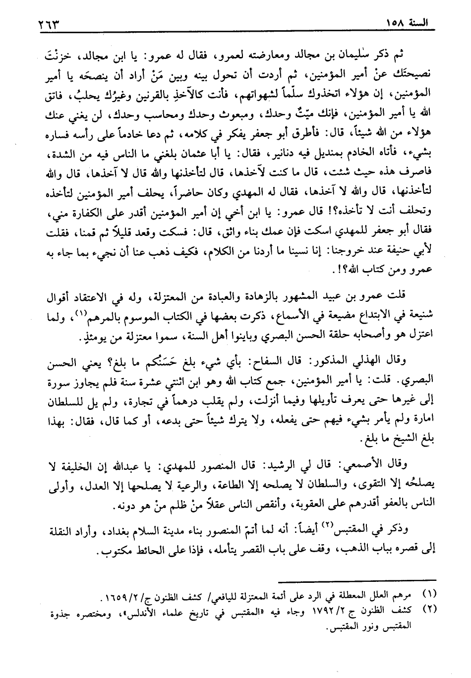 ثم ذكر سليمان بن مجالد ومعارضته لعمرو، فقال له عمرو: يا ابن مجالد، خزنت نصيحتك عن أمير المؤمنين، ثم أردت أن تحول بينه وبين من أراد أن ينصحه يا أمير المؤمنين، ان هؤلاء اتخذوك سلماً لشهواتهم، فأنت كالآخذ بالقرنين وغيرك يحلب، فاتق الله يا أمير المؤمنين، فإنك ميت وحدك، ومبعوث وحدك ومحاسب وحدك، لن يغني عنك هؤلاء من الله شيئاً، قال: فأطرق أبو جعفر يفكر في كلامه، ثم دعا خادماً على رأسه فسار بشيء، فأتاه الخادم بمنديل فيه دنانير، فقال: يا أبا عثمان بلغني ما الناس فيه من الشدة، فاصرف هذه حيث شئت، قال ما كنت لآخذها، قال لتأخذها والله قال لا آخذها، قال والله لتأخذنها، قال والله لا آخذها، فقال له المهدي وكان حاضراً، يحلف أمير المؤمنين لتأخذه وتحلف أنت لا تأخذه؟! قال عمرو: يا ابن أخي إن أمير المؤمنين أقدر على الكفارة مني، فقال أبو جعفر للمهدي اسكت فإن عمك بناء واثق، قال: فسكت وقعد قليلاً ثم قمنا، فقلت لأبي حنيفة عند خروجنا: انا نسينا ما أردنا من الكلام، فكيف ذهب عنا أن نجيء بما جاء به عمرو ومن كتاب الله؟!. قلت عمرو بن عبيد المشهور بالزهادة والعبادة من المعتزلة، وله في الاعتقاد أقوال شنيعة في الابتداع مضيعة في الأسماع، ذكرت بعضها في الكتاب الموسوم بالمرهم، ولما اعتزل هو وأصحابه حلقة الحسن البصري وباينوا أهل السنة، سموا معتزلة من يومئذ. وقال الهذلي المذكور: قال السفاح: بأي شيء بلغ حسنكم ما بلغ؟ يعني الحسن البصري. قلت: يا أمير المؤمنين، جمع كتاب الله وهو ابن اثنتي عشرة سنة فلم يجارز سورة إلى غيرها حتى يعرف تأويلها وفيما أنزلت، ولم يقلب درهماً في تجارة، ولم يل للسلطان امارة ولم يأمر بشيء فيهم حتى يفعله، ولا يترك شيئاً حتى بدعه، او كما قال، فقال: بهذ بلغ الشيخ ما بلغ. وقال الأصمعي: قال لي الرشيد: قال المنصور للمهدي: يا عبد الله إن الخليفة لا يصلحه إلا التقوى، والسلطان لا يصلحه إلا الطاعة، والرعية لا يصلحها إلا العدل، وأولى الناس بالعفو أقدرهم على العقوبة، وأنقص الناس عقلاً من ظلم من هو دونه. وذكر في المقتبس أيضاً: انه لما أتم المنصور بناء مدينة السلام بغداد، وأراد النقلة إلى قصره بباب الذهب، وقف على باب القصر يتأمله، فإذا على الحائط مكتوب.