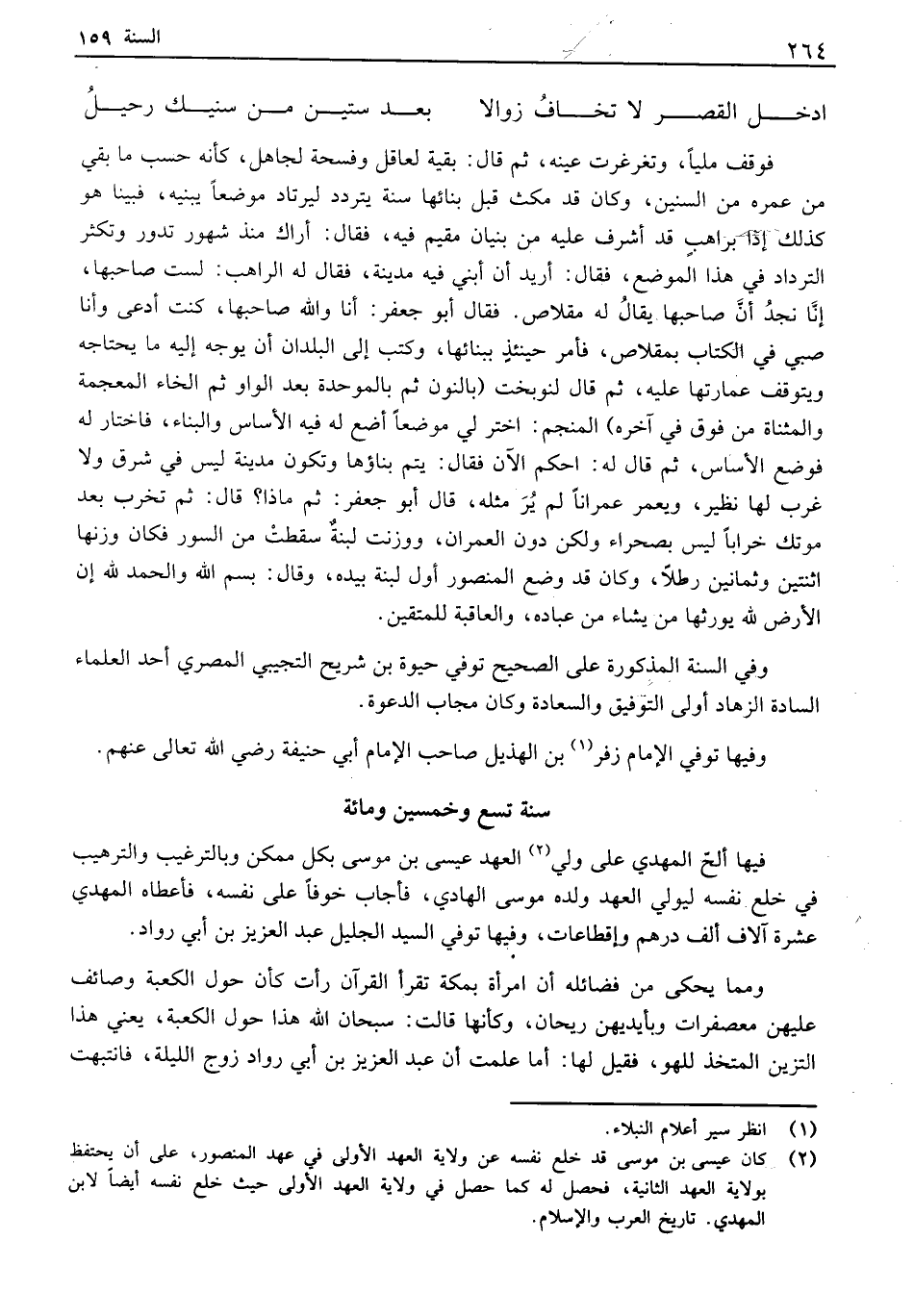فوقف ملياً، وتغرغرت عينه، ثم قال: بقية لعاقل وفسحة لجاهل، كأنه حسب ما بقي من عمره من السنين، وكان قد مكث قبل بنائها سنة يتردد ليرتاد موضعاً يبنيه، فبينا هو كذلك إذا براهب قد أشرف عليه من بنيان مقيم فيه، فقال: اراك منذ شهور تدور وتكثر الترداد في هذا الموضع، فقال: اريد أن أبني فيه مدينة، فقال له الراهب: لست صاحبها، انا نجد أن صاحبها يقال له مقلاص. فقال أبو جعفر: انا والله صاحبها، كنت أدعى وأنا صبي في الكتاب بمقلاص، فأمر حينئذ ببنائها، وكتب إلى البلدان أن يوجه إليه ما يحتاجه ويتوقف عمارتها عليه، ثم قال لنوبخت بالنون ثم بالموحدة بعد الواو ثم الخاء المعجمة والمثناة من فوق في آخره المنجم: اختر لي موضعاً أضع له فيه الأساس والبناء، فاختار له فوضع الأساس، ثم قال له: احكم الآن فقال: يتم بناؤها وتكون مدينة ليس في شرق ولا غرب لها نظير، ويعمرعمراناً لم ير مثله، قال أبو جعفر: ثم ماذا؟ قال: ثم تخرب بعد موتك خراباً ليس بصحراء ولكن دون العمران، ووزنت لبنة سقطت من السور فكان وزنها اثنتين وثمانين رطلاً، وكان قد وضع المنصور أول لبنة بيده، وقال: بسم الله والحمد لله إن الأرض لله يورثها من يشاء من عباده، والعاقبة للمتقين. وفي السنة المذكورة على الصحيح توفي حيوة بن شريح التجيبي المصري أحد العلماء السادة الزهاد أولى التوفيق والسعادة وكان مجاب الدعوة. وفيها توفي الإمام زفر بن الهذيل صاحب الإمام أبي حنيفة رضي الله تعالى عنهم.