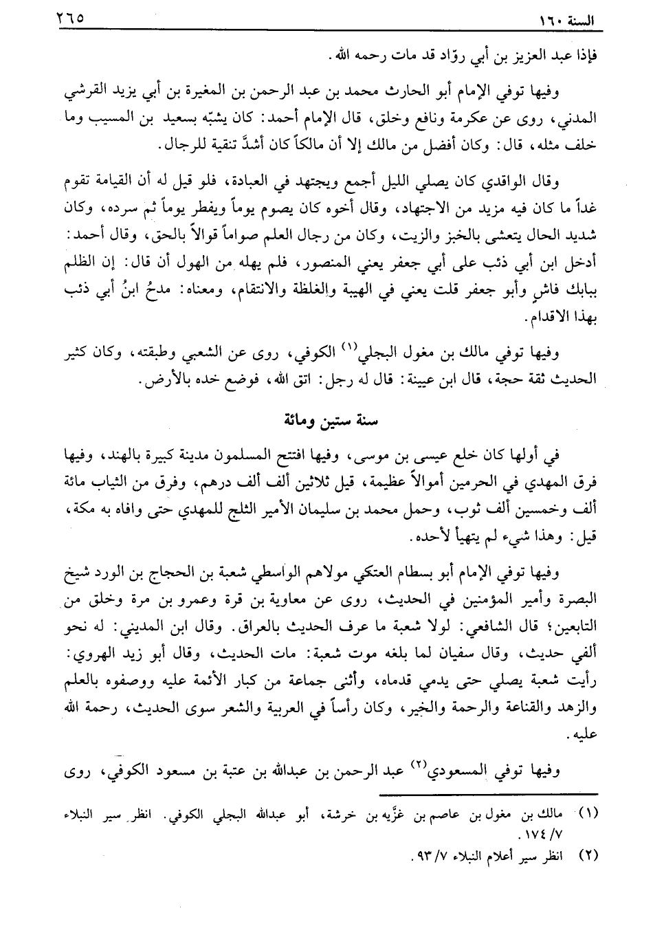 وقال الواقدي كان يصلي الليل أجمع ويجتهد في العبادة، فلو قيل له أن القيامة تقوم غداً ما كان فيه مزيد من الاجتهاد، وقال أخوه كان يصوم يوماً ويفطر يوماً ثم سرده، وكان شديد الحال يتعشى بالخبز والزيت، وكان من رجال العلم صواماً قوالاً بالحق، وقال أحمد: ادخل ابن أبي ذئب على أبي جعفر يعني المنصور، فلم يهله من الهول أن قال: ان الظلم ببابك فاش وأبو جعفر قلت يعني في الهيبة والغلظة والانتقام، ومعناه: مدح ابن أبي ذئب بهذا الاقدام. وفيها توفي مالك بن مغول البجلي الكوفي، روى عن الشعبي وطبقته، وكان كثير الحديث ثقة حجة، قال ابن عيينة: قال له رجل: اتق الله، فوضع خده بالأرض.