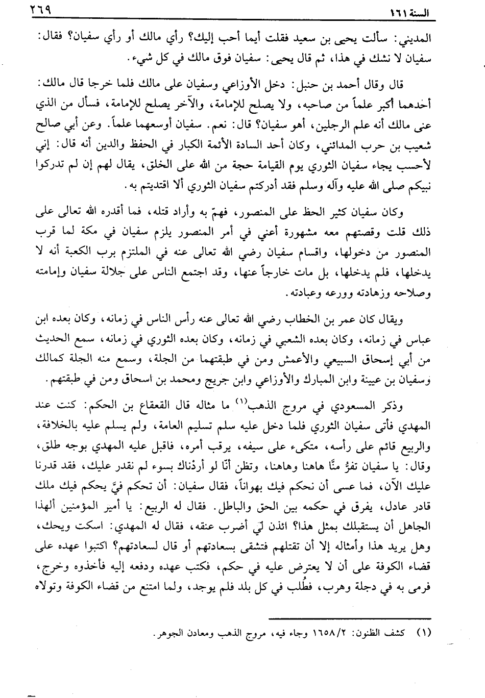 المديني: سألت يحيى بن سعيد فقلت أيما أحب إليك؟ رأي مالك أو رأي سفيان؟ فقال: سفيان لا نشك في هذا، ثم قال يحيى: سفيان فوق مالك في كل شيء. قال وقال أحمد بن حنبل: دخل الأوزاعي وسفيان على مالك فلما خرجا قال مالك: احدهما أكبر علماً من صاحبه، ولا يصلح للإمامة، والآخر يصلح للإمامة، فسأل من الذي عنى مالك أنه علم الرجلين، اهو سفيان؟ قال: نعم. سفيان أوسعهما علماً. وعن أبي صالح شعيب بن حرب المدائني، وكان أحد السادة الأئمة الكبار في الحفظ والدين أنه قال: اني لأحسب يجاء سفيان الثوري يوم القيامة حجة من الله على الخلق، يقال لهم إن لم تدركوا نبيكم صلى الله عليه وآله وسلم فقد أدركتم سفيان الثوري ألا اقتديتم به. وكان سفيان كثير الحظ على المنصور، فهم به وأراد قتله، فما أقدره الله تعالى على ذلك قلت وقصتهم معه مشهورة أعني في أمر المنصور يلزم سفيان في مكة لما قرب المنصور من دخولها، واقسام سفيان رضي الله تعالى عنه في الملتزم برب الكعبة أنه لا يدخلها، فلم يدخلها، بل مات خارجاً عنها، وقد اجتمع الناس على جلالة سفيان وإمامته وصلاحه وزهادته وورعه وعبادته. ويقال كان عمر بن الخطاب رضي الله تعالى عنه رأس الناس في زمانه، وكان بعده ابن عباس في زمانه، وكان بعده الشعبي في زمانه، وكان بعده الثوري في زمانه، سمع الحديث من أبي إسحاق السبيعي والأعمش ومن في طبقتهما من الجلة، وسمع منه الجلة كمالك وسفيان بن عيينة وابن المبارك والأوزاعي وابن جريج ومحمد بن اسحاق ومن في طبقتهم. وذكر المسعودي في مروج الذهب ما مثاله قال القعقاع بن الحكم: كنت عند المهدي فأتى سفيان الثوري فلما دخل عليه سلم تسليم العامة، ولم يسلم عليه بالخلافة، والربيع قائم على رأسه، متكىء على سيفه، يرقب أمره، فاقبل عليه المهدي بوجه طلق، وقال: يا سفيان تفر منا هاهنا وهاهنا، وتظن أنا لو أردناك بسوء لم نقدر عليك، فقد قدرنا عليك الآن، فما عسى أن نحكم فيك بهواناً، فقال سفيان: ان تحكم في يحكم فيك ملك قادرعادل، يفرق في حكمه بين الحق والباطل. فقال له الربيع: يا أمير المؤمنين ألهذا الجاهل أن يستقبلك بمثل هذا؟ ائذن لي أضرب عنقه، فقال له المهدي: اسكت ويحك، وهل يريد هذا وأمثاله إلا أن تقتلهم فتشقى بسعادتهم أو قال لسعادتهم؟ اكتبوا عهده على قضاء الكوفة على أن لا يعترض عليه في حكم، فكتب عهده ودفعه إليه فأخذوه وخرج، فرمى به في دجلة وهرب، فطلب في كل بلد فلم يوجد، ولما امتنع من قضاء الكوفة وتولاه