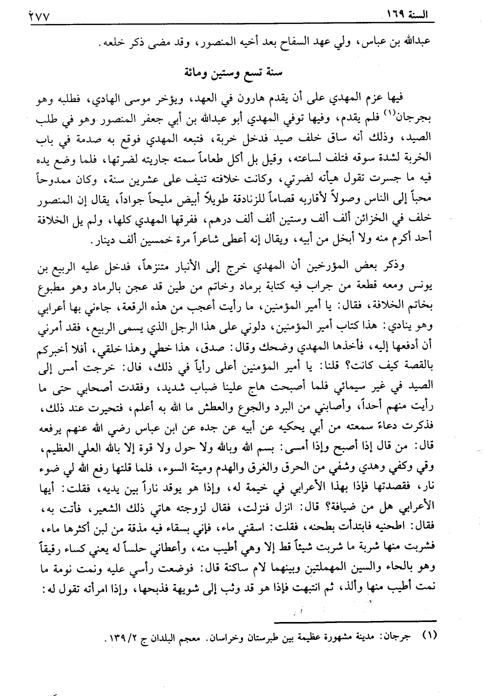 فيها عزم المهدي على أن يقدم هارون في العهد، ويؤخر موسى الهادي، فطلبه وهو بجرجان فلم يقدم، وفيها توفي المهدي أبو عبد الله بن أبي جعفر المنصور وهو في طلب الصيد، وذلك أنه ساق خلف صيد فدخل خربة، فتبعه المهدي فوقع به صدمة في باب الخربة لشدة سوقه فتلف لساعته، وقيل بل أكل طعاماً سمته جاريته لضرتها، فلما وضع يده فيه ما جسرت تقول هيأته لضرتي، وكانت خلافته تنيف على عشرين سنة، وكان ممدوحاً محباً إلى الناس وصولاً لأقاربه قصاماً للزنادقة طويلاً أبيض مليحاً جواداً، يقال إن المنصور خلف في الخزائن ألف ألف وستين ألف ألف درهم، ففرقها المهدي كلها، ولم يل الخلافة أحد أكرم منه ولا أبخل من أبيه، ويقال إنه أعطى شاعراً مرة خمسين ألف دينار. وذكر بعض المؤرخين أن المهدي خرج إلى الأنبار متنزهاً، فدخل عليه الربيع بن يونس ومعه قطعة من جراب فيه كتابة برماد وخاتم من طين قد عجن بالرماد وهو مطبوع بخاتم الخلافة، فقال: يا أمير المؤمنين، ما رأيت أعجب من هذه الرقعة، جاءني بها أعرابي وهو ينادي: هذا كتاب أمير المؤمنين، لوني على هذا الرجل الذي يسمى الربيع، فقد أمرني أن أدفعها إليه، فأخذها المهدي وضحك وقال: صدق، هذا خطي وهذا خلقي، افلا أخبركم بالقصة كيف كانت؟ قلنا: يا أمير المؤمنين أعلى رأياً في ذلك، فال: خرجت أمس إلى الصيد في غير سيمائي فلما أصبحت هاج علينا ضباب شديد، وفقدت أصحابي حتى ما رأيت منهم أحداً، وأصابني من البرد والجوع والعطش ما الله به أعلم، فتحيرت عند ذلك، فذكرت دعاء سمعته من أبي يحكيه عن أبيه عن جده عن ابن عباس رضي الله عنهم يرفعه قال: من قال إذا أصبح وإذا أمسى: بسم الله وبالله ولا حول ولا قوة إلا بالله العلي العظيم، وقي وكفي وهدي وشفي من الحرق والغرق والهدم وميتة السوء، فلما قلتها رفع الله لي ضوء نار، فقصدتها فإذا بهذا الأعرابي في خيمة له، وإذا هو يوقد ناراً بين يديه، فقلت: ايها الأعرابي هل من ضيافة؟ قال: انزل فنزلت، فقال لزوجته هاتي ذلك الشعير، فأتت به، فقال: اطحنيه فابتدأت بطحنه، فقلت: اسقني ماء، فإني بسقاء فيه مذقة من لبن أكثرها ماء، فشربت منها شربة ما شربت شيئاً قط إلا وهي أطيب منه، وأعطاني حلساً له يعني كساء رقيقاً وهو بالحاء والسين المهملتين وبينهما لام ساكنة قال: فوضعت رأسي عليه ونمت نومة ما نمت أطيب منها وألذ، ثم انتبهت فإذا هو قد وثب إلى شويهة فذبحها، وإذا امرأته تقول له:
