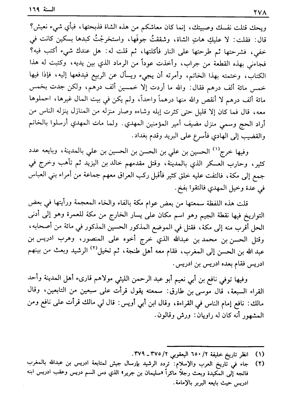 ويحك قتلت نفسك وصبيتك، انما كان معاشكم من هذه الشاة فذبحتها، فبأي شيء نعيش؟ قال: فقلت: لا عليك هات الشاة، وشققت جوفها، واستخرجت كبدها بسكين كانت في خفي، فشرحتها ثم طرحتها على النار فأكلتها، ثم قلت له: هل عندك شيء أكتب فيه؟ فجاءني بهذه القطعة من جراب، وأخذت عوداً من الرماد الذي بين يديه، وكتبت له هذا الكتاب، وختمته بهذا الخاتم، وأمرته أن يجيء ويسأل عن الربيع فيدفعها إليه، فإذا فيها خمس مائة ألف درهم فقال: والله ما أردت إلا خمسين ألف درهم، ولكن جدت بخمس مائة ألف درهم لا أنقص والله منها درهماً واحداً، ولم يكن في بيت المال غيرها، احملوها معه، قال فما كان إلا قليل حتى كثرت إبله وشاءه وصار منزله من المنازل ينزله الناس من أراد الحج وسمي منزل مضيف أمير المؤمنين المهدي. ولما مات المهدي أرسلوا بالخاتم والقضيب إلى الهادي فأسرع على البريد وقدم بغداد. وفيها خرج الحسين بن علي بن الحسن بن الحسين بن علي بالمدينة، وبايعه عدد كثير، وحارب العسكر الذي بالمدينة، وقتل مقدمهم خالد بن اليزيد ثم تأهب وخرج في جمع إلى مكة، فالتفت عليه خلق كثير فأقبل ركب العراق معهم جماعة من أمراء بني العباس في عدة وخيل المهدي فالتقوا بفخ. قلت هذه اللفظة سمعتها من بعض عوام مكة بالفاء والخاء المعجمة ورأيتها في بعض التواريخ فيها نقطة الجيم وهو اسم مكان على يسار الخارج من مكة للعمرة وهو إلى أدنى الحل أقرب منه إلى مكة، فقتل في الموضع المذكور الحسين المذكور في مائة من أصحابه، وقتل الحسن بن محمد بن عبد الله الذي خرج أخوه على المنصور، وهرب ادريس بن عبد الله بن الحسن إلى المغرب، فقام معه أهل طنجة، ثم تخيل الرشيد وبعث من بينهم ادريس فقام بعده ادريس بن ادريس. وفيها توفي نافع بن أبي نعيم أبو عبد الرحمن الليثي مولاهم قارىء أهل المدينة وأحد القراء السبعة، قال موسى بن طارق: سمعته يقول قرأت على سبعين من التابعين، وقال مالك: نافع إمام