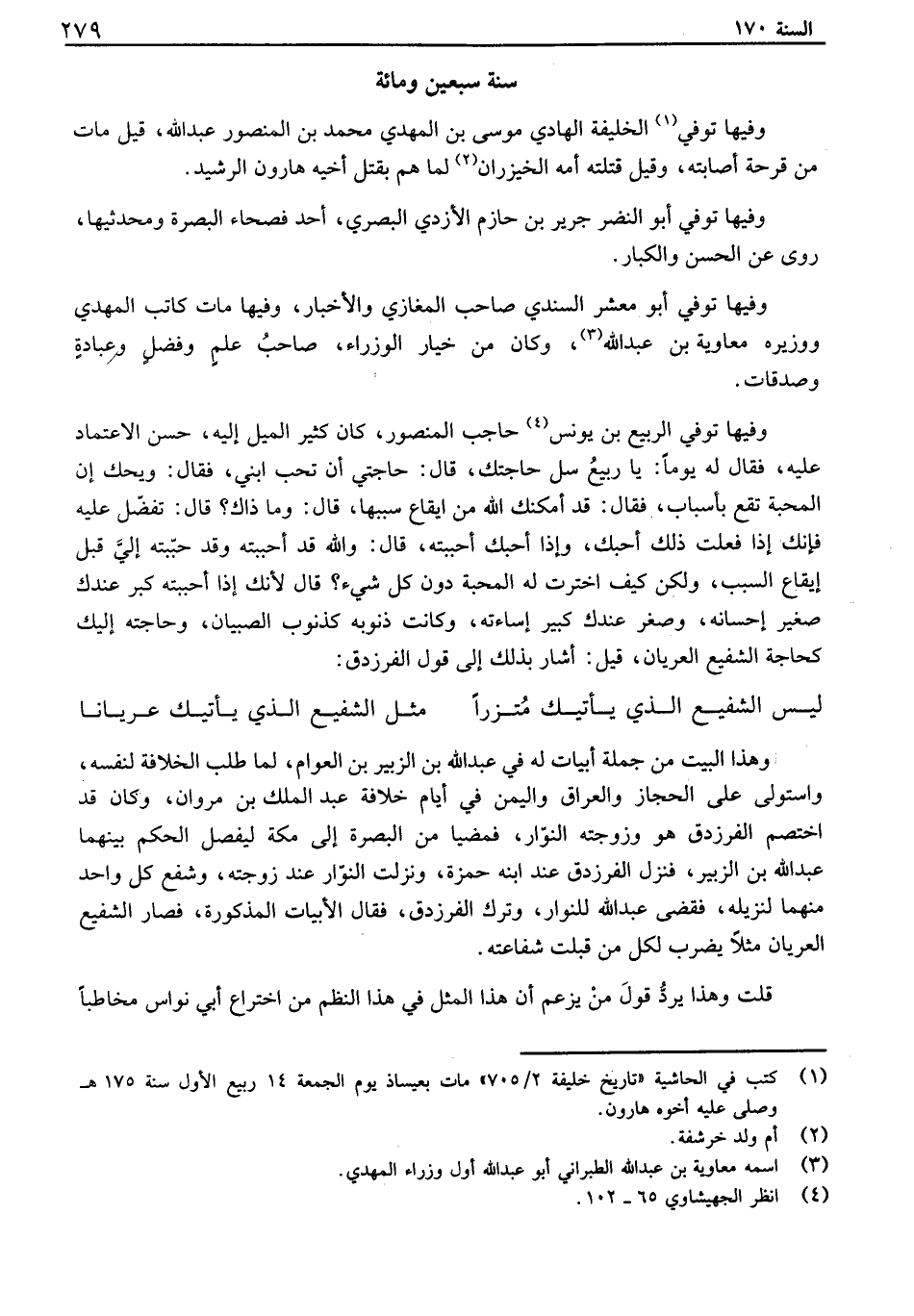 وفيها توفي الخليفة الهادي موسى بن المهدي محمد بن المنصور عبد الله، قيل مات من قرحة أصابته، وقيل قتلته أمه الخيزران لما هم بقتل أخيه هارون الرشيد. وفيها توفي أبو النضر جرير بن حازم الأزدي البصري، احد فصحاء البصرة ومحدثيها، روى عن الحسن والكبار. وفيها توفي أبو معشر السندي صاحب المغازي والأخبار، وفيها مات كاتب المهدي ووزيره معاوية بن عبد الله، وكان من خيار الوزراء، صاحب علم وفضل وعبادة وصدقات. وفيها توفي الربيع بن يونس حاجب المنصور، كان كثير الميل إليه، حسن الاعتماد عليه، فقال له يوماً: يا ربيع سل حاجتك، قال: حاجتي أن تحب ابني، فقال: ويحك إن المحبة تقع بأسباب، فقال: قد أمكنك الله من ايقاع سببها، قال: وما ذاك؟ قال: تفضل عليه فإنك إذا فعلت ذلك أحبك، وإذا أحبك أحببته، قال: والله قد أحببته وقد حببته إلي قبل إيقاع السبب، ولكن كيف اخترت له المحبة دون كل شيء؟ قال لأنك إذا أجبته كبرعندك صغير إحسانه، وصغرعندك كبير إساءته، وكانت ذنوبه كذنوب الصبيان، وحاجته إليك كحاجة الشفيع العريان، قيل: اشار بذلك إلى قول الفرزدق: