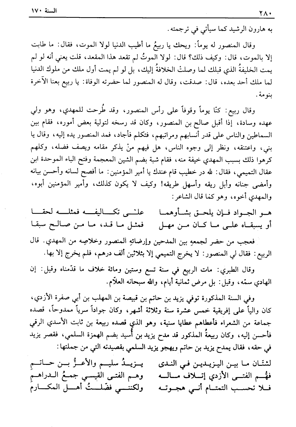 فعجب من حضر لجمعه بين المدحين وإرضائه المنصور وخلاصه من المهدي. قال الربيع: فقال لي المنصور: لا يخرج التميمي إلا بثلاثين ألف درهم، فلم يخرج إلا بها. وقال الطبري: مات الربيع في سنة تسع وستين ومائة خلاف ما قدمناه وقيل: ان الهادي سمه، وقيل: بل مرض ثمانية أيام، والله سبحانه العلام. وفي السنة المذكورة توفي يزيد بن حاتم بن قبيصة بن المهلب بن أبي صفرة الأزدي، كان والياً على إفريقية خمس عشرة سنة وثلاثة أشهر، وكان جواداً سرياً ممدوحاً، قصده جماعة من الشعراء فأعطاهم عطايا سنية، وهو الذى قصده ربيعة بن ثابت الأسدي الرقي فأحسن إليه، وكان ربيعة المذكور قد مدح يزيد بن أسيد بضم الهمزة السلمي، فقصر يزيد في حقه، فقال يمدح يزيد بن حاتم ويهجو يزيد السلمي بقصيدته التي من جملتها:
