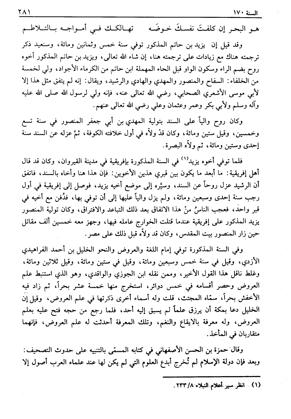 وقد قيل إن يزيد بن حاتم المذكور توفي سنة خمس وثمانين ومائة، وسنعيد ذكر ترجمته هناك مع زيادات على ترجمته هنا، ان شاء الله تعالى، ويزيد بن حاتم المذكور أخوه روح بضم الراء وسكون الواو قبل الحاء المهملة ابن حاتم من الكرماء الأجواد، ولي لخمسة من الخلفاء: السفاح والمنصور والمهدي والهادي والرشيد، ويقال: انه لم يتفق مثل هذا إلا لأبي موسى الأشعري الصحابي، رضي الله تعالى عنه، فإنه ولي لرسول الله صلى الله عليه وآله وسلم ولأبي بكروعمر وعثمان وعلي رضي الله تعالى عنهم. وكان روح والياً على السند بتولية المهدي بن أبي جعفر المنصور في سنه تسع وخمسين، وقيل ستين ومائة، وكان قد ولاه في أول خلافته الكوفة، ثم عزله عن السند سنة إحدى وستين ومائة، ثم ولاه البصرة. فلما توفي أخوه يزيد في السنة المذكوره بإفريقية في مدينة القيروان، وكان قد قال أهل إفريقية: ما أبعد ما يكون بين قبري هذين الأخوين: فإن هذا هنا وأخاه بالسند، فاتفق أن الرشيد عزل روحاً عن السند، وسيره إلى موضع أخيه يزيد، فوصل إلى إفريقية في أول رجب سنة إحدى وسبعين ومائة، ولم يزل والياً عليها إلى أن توفي بها، فدفن مع أخيه في قبر واحد، فعجب الناس من هذا الاتفاق بعد ذلك التباعد والافتراق، وكان تولية المنصور يزيد المذكور على إفريقية عندما قتلت الخوارج عامله فيها، وجهز معه خمسين ألف مقاتل حين زار المنصور بيت المقدس، وكان قد ولاه قبل ذلك على مصر. وفي السنة المذكورة توفي إمام اللغة والعروض والنحو الخليل بن أحمد الفراهيدي الأزدي، وقيل في سنة خمس وسبعين ومائة، وقيل في ستين ومائة، وقيل ثلاثين ومائة، وغلط ناقل هذا القول الأخير، وممن نقله ابن الجوزي والواقدي، وهو الذي استنبط علم العروض وحصر أقسامه في خمس دوائر، استخرج منها خمسة عشر بحراً، ثم زاد فيه الأخفش بحراً، سقاه المجتث، قلت وله أسماء أخرى ذكرتها في علم العروض، وقيل إن الخليل دعا بمكة أن يرزق علماً لم يسبق إليه أحد، فلما رجع من حجه فتح عليه بعلم العروض، وله معرفة بالايقاع والنغم، وتلك المعرفة أحدثت له علم العروض، فإنهما متقاربان في المأخذ. وقال حمزة بن الحسن الأصفهاني في كتابه المسمى بالتنبيه على حدوث التصحيف: وبعد فإن دولة الإسلام لم تخرج أبدع العلوم التي لم يكن لها عند علماء العرب أصول إلا
