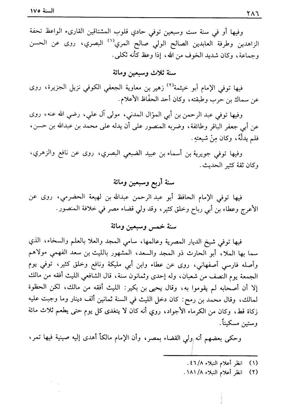 فيها توفي شيخ الديار المصرية وعالمها، سامي المجد والعلا بالعلم والسخاء، الذي سما بها الملا، ابو الحارث ذو المجد والسعد، المشهور بالليث بن سعد الفهمي مولاهم وأصله فارسي أصفهاني، روى عن عطاء وابن أبي مليكة ونافع وخلق كثير، توفي يوم الجمعة يوم النصف من شعبان، وله إحدى وثمانون سنة، قال الشافعي الليث أفقه من مالك إلا أن أصحابه لم يقوموا به، وقال يحيى بن بكير: الليث أفقه من مالك، لكن الحظوة لمالك، وقال محمد بن رمح: كان دخل الليث في السنة ثمانين ألف دينار وما وجبت عليه زكاة قط، وكان من الكرماء الأجواد، روي أنه كان لا يتغدى كل يوم حتى يطعم ثلاث مائة وستين مسكيناً. وحكى بعضهم أنه ولي القضاء بمصر، وأن الإمام مالكاً أهدى إليه صينية فيها تمر،
