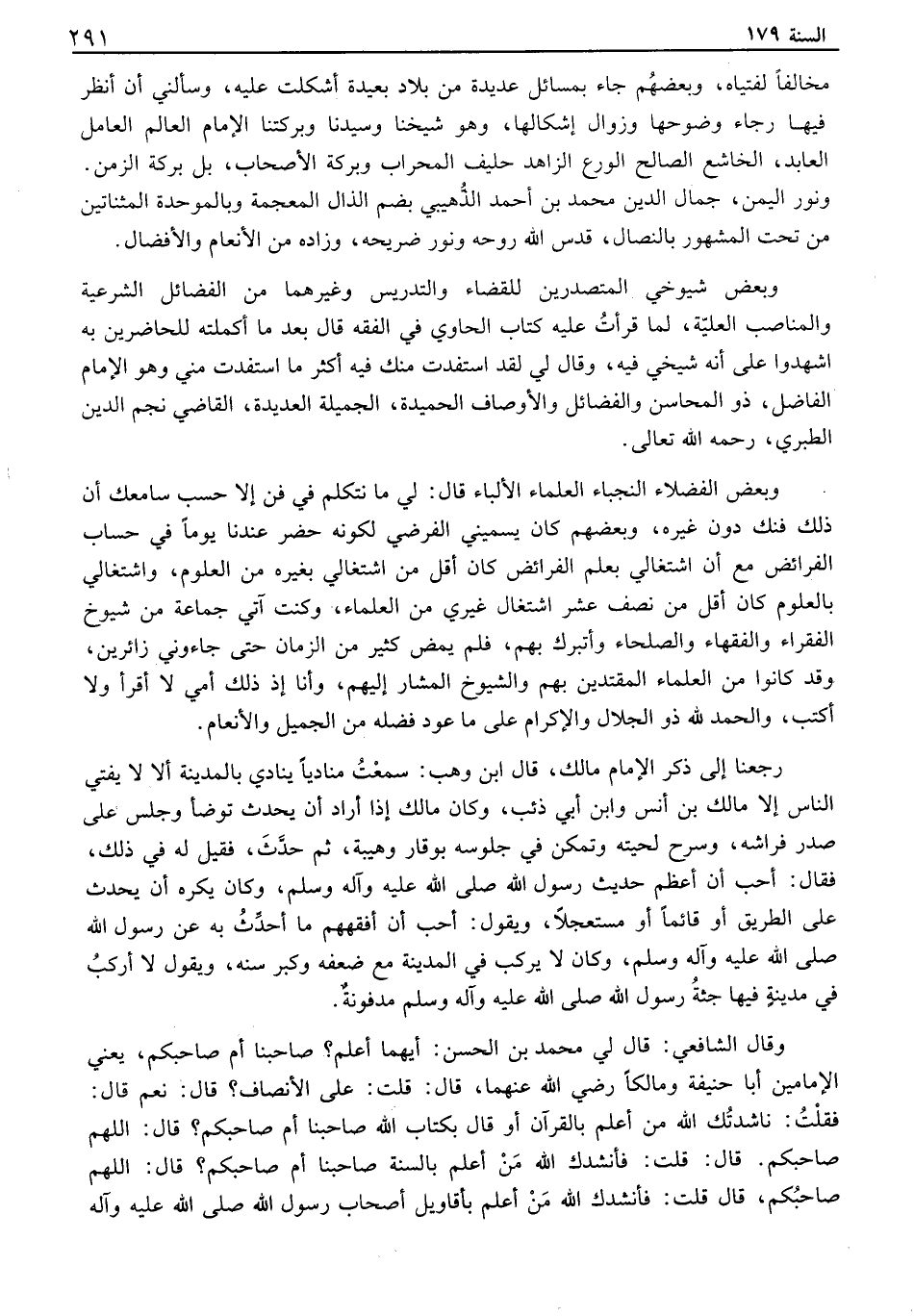مخالفاً لفتياه، وبعضهم جاء بمسائل عديدة من بلاد بعيدة اشكلت عليه، وسالني أن أنظرفيها رجاء وضوحها وزوال إشكالها، وهو شيخنا وسيدنا وبركتنا الإمام العالم العامل العابد، الخاشع الصالح الورع الزاهد حليف المحراب وبركة الأصحاب، بل بركة الزمن. ونور اليمن، جمال الدين محمد بن أحمد الذهيبي بضم الذال المعجمة وبالموحدة المثناتين من تحت المشهور بالنصال، قدس الله روحه ونور ضريحه، وزاده من الأنعام والأفضال. وبعض شيوخي المتصدرين للقضاء والتدريس وغيرهما من الفضائل الشرعية والمناصب العلية، لما قرأت عليه كتاب الحاوي في الفقه قال بعد ما أكملته للحاضرين به اشهدوا على أنه شيخي فيه، وقال لي لقد استفدت منك فيه أكثر ما استفدت مني وهو الامام الفاضل، ذو المحاسن والفضائل والأوصاف الحميدة، الجميلة العديدة، القاضي نجم الدين الطبري، رحمه الله تعالى. وبعض الفضلاء النجباء العلماء الألباء قال: لي ما نتكلم في فن إلا حسب سامعك أن ذلك فنك دون غيره، وبعضهم كان يسميني الفرضي لكونه حضر عندنا يوماً في حساب الفرائض مع أن اشتغالي بعلم الفرائض كان أقل من اشتغالي بغيره من العلوم، واشتغالي بالعلوم كان أقل من نصف عشر اشتغال غيري من العلماء، وكنت آتي جماعة من شيوخ الفقراء والفقهاء والصلحاء وأتبرك بهم، فلم يمض كثير من الزمان حتى جاءوني زائرين، وقد كانوا من العلماء المقتدين بهم والشيوخ المشار إليهم، وأنا إذ ذلك أمي لا أقرأ ولا أكتب، والحمد لله ذو الجلال والإكرام على ما عود فضله من الجميل والأنعام. رجعنا إلى ذكر الإمام مالك، قال ابن وهب: سمعت منادياً ينادي بالمدينة ألا لايفتي الناس إلا مالك بن أنس وابن أبي ذئب، وكان مالك إذا أراد أن يحدث توضأ وجلس صدر فراشه، وسرح لحيته وتمكن في جلوسه بوقار وهيبة، ثم حدث، فقيل له في ذلك، فقال: احب أن أعظم حديث رسول الله صلى الله عليه وآله وسلم، وكان يكره أن يحدث على الطريق أو قائماً أو مستعجلاً، ويقول: احب أن أفقههم ما أحدث به عن رسول الله صلى الله