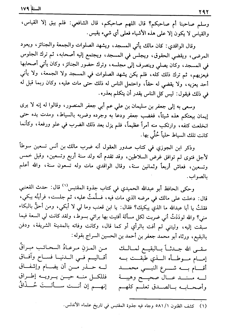 وسلم صاحبنا أم صاحبكم؟ قال اللهم صاحبكم، قال الشافعي: فلم يبق إلا القياس، والقياس لا يكون إلا على هذه الأشياء فعلى أي شيء يقيس. وقال الواقدي: كان مالك يأتي المسجد، ويشهد الصلوات والجمعة والجنائز، ويعود المرضى، ويقضي الحقوق، ويجلس في المسجد، ويجتمع إليه أصحابه، ثم ترك الجلوس في المسجد، وكان يصلي وينصرف إلى مجلسه، وترك حضور الجنائز، وكان يأتي أصحابها فيعزيهم، ئم ترك ذلك كله، فلم يكن يشهد الصلوات في المسجد ولا الجمعة، ولا يأتي أحد يعزيه، ولا يقضي له حقاً، واحتمل الناس له ذلك حتى مات عليه، وكان ربما قيل له في ذلك فيقول: ليس كل الناس يقدر أن يتكلم بعذره. وسعى به إلى جعفر بن سليمان بن علي عم أبي جعفر المنصور، وقالوا له إنه لا يرى إيمان بيعتكم هذه شيئاً، فغضب جعفر ودعا به وجرده وضربه بالسياط، ومدت يده حتى انخلعت كتفه، وارتكب منه أمراً عظيماً، فلم يزل بعد ذلك الضرب في علو ورفعة، وكأنما كانت تلك السياط حلياً حلي بها. وذكر ابن الجوزي في كتاب صدور العقول أنه ضرب مالك بن أنس تسعين سوطاً لأجل فتوى لم توافق غرض السلاطين، وقد تقدم أنه ولد سنة أربع وتسعين، وقيل خمس وتسعين، فعاش أربعاً وثمانين سنة، وقال الواقدي مات وله تسعون سنة، والله أعلم با لصواب. وحكى الحافظ أبو عبد الله الحميدي في كتاب جذوة المقتبس قال: حدث القعنبي قال: دخلت على مالك في مرضه الذي مات فيه، فسلمت عليه، ثم جلست، فرأيته يبكي، فقلت يا أبا عبد الله ما الذي يبكيك؟ فقال: يا ابن قعنب وما لي لا أبكي، ومن أحق بالبكاء مني؟ والله لوددت أني ضربت لكل مسألة أفتيت بها برائي بسوط، ولقد كانت لي السعة فيما سبقت إليه، وليتني لم أفت بالرأي أو كما قال، وكانت وفاته بالمدينة الشريفة، ودفن بالبقيع، ورثاه أبو محمد جعفر بن أحمد بن الحسين السراج بقوله: